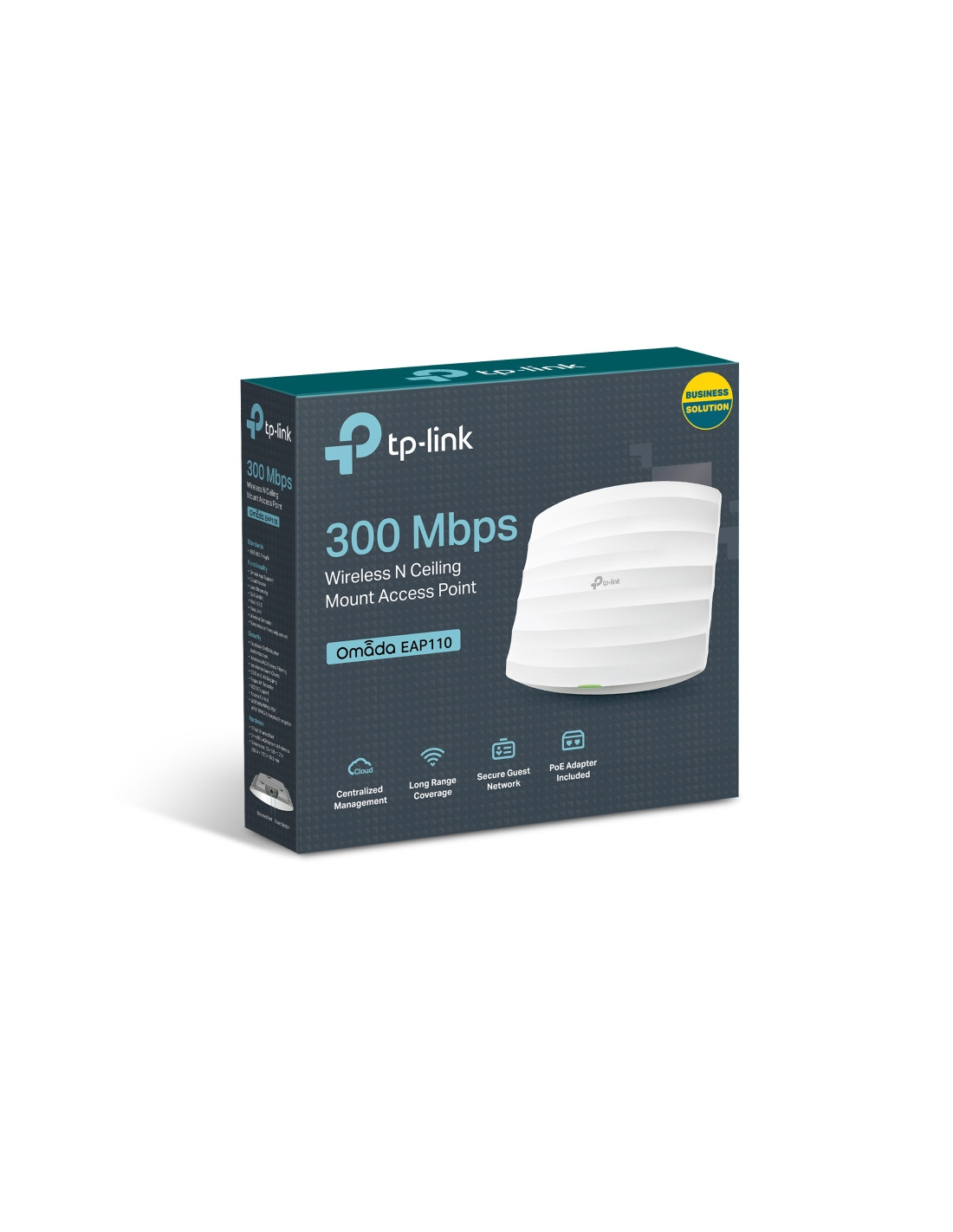 TP-Link EAP110. 2.4 GHz, Velocità massima di trasferimento dati: 300 Mbit/s. Algoritmi di sicurezza supportati: 64-bit WEP, 128-bit WEP, 152-bit WEP, HTTPS, SNMP, SNMPv2, SSH, WPA, WPA-PSK, WPA2-Enterprise,.... Velocità trasferimento Ethernet LAN: 10,100 Mbit/s. Supporto Power over Ethernet (PoE). Colore del prodotto: Bianco