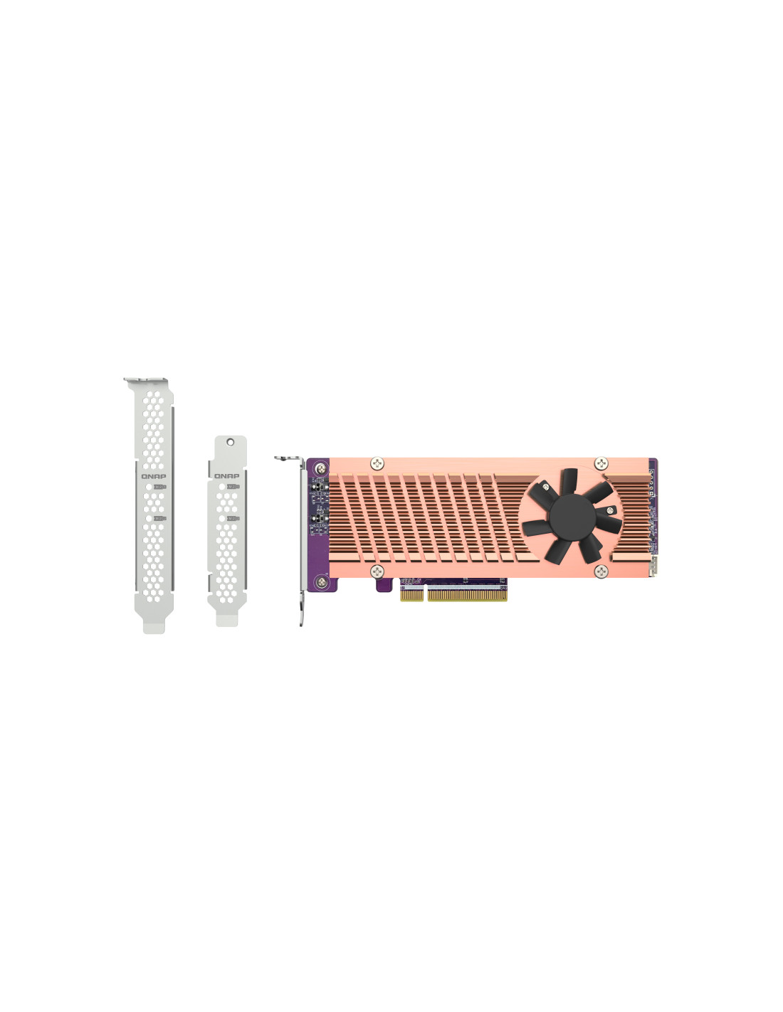QNAP QM2-2P-384A. Interfaccia host: PCIe, Interfaccia di uscita: M.2, Scheda di espansione standard: PCIe 3.0. Colore del prodotto: Marrone, Grigio, Utilizzo: NAS / Storage server, Tipo di raffreddamento: Attivo. Velocità massima di trasmissione: 32 Gbit/s. Larghezza: 68,9 mm, Profondità: 170,5 mm, Altezza: 19,3 mm. Quantità per pacco: 1 pz
