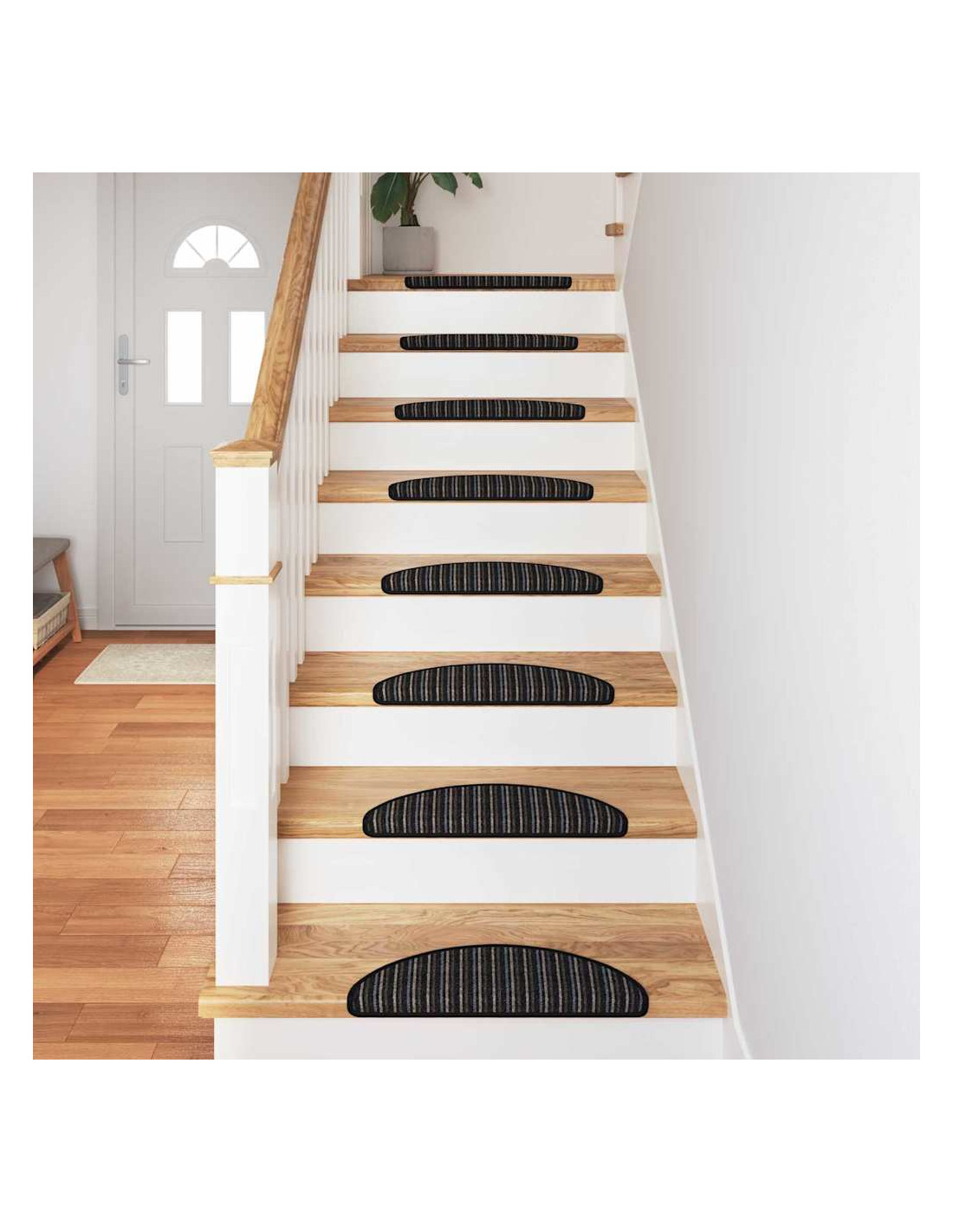 - Aestetica funzionale: Con una forma semi-circolare e un motivo a righe con linee parallele di diverse larghezze e colori, questi gradini uniscono funzionalità ed estetica moderna. Si integrano bene in molti stili di arredamento, aggiungendo praticità e bellezza a qualsiasi scala.