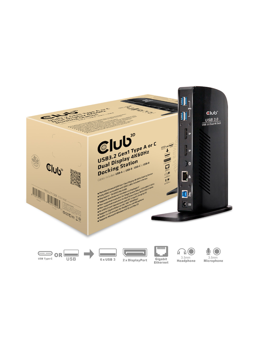 CLUB3D USB3.2 Gen1 Type A or C Dual Display 4K60Hz Docking Station DisplayLink® Certified. Tecnologia di connessione: Docking, Interfaccia host: USB 3.2 Gen 1 (3.1 Gen 1) Type-B, Connessione cuffia: 3,5 mm. Velocità trasferimento Ethernet LAN: 10,100,1000 Mbit/s. Colore del prodotto: Nero, Risoluzione (digitale massima): 5120 x 2880 Pixel, Tempo massimo di refresh: 60 Hz. Tipologia alimentazione: dC, Voltaggio di uscita: 5 V, Lunghezza cavo USB: 1 m. Sistema operativo Windows supportato: Windows 10, Windows 7, Windows 8