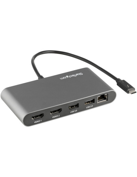 Dotata di certificazione Thunderbolt™ 3, questa mini docking station compatta offre collegamenti essenziali per la produttività. Alimentata tramite bus, consente il collegamento a due display HDMI 4K, a una porta Gigabit Ethernet e a due porte USB-A (USB 3.2/2.0), nonché una configurazione flessibile grazie al cavo Thunderbolt 3 integrato di ben 28 cm di lunghezza.