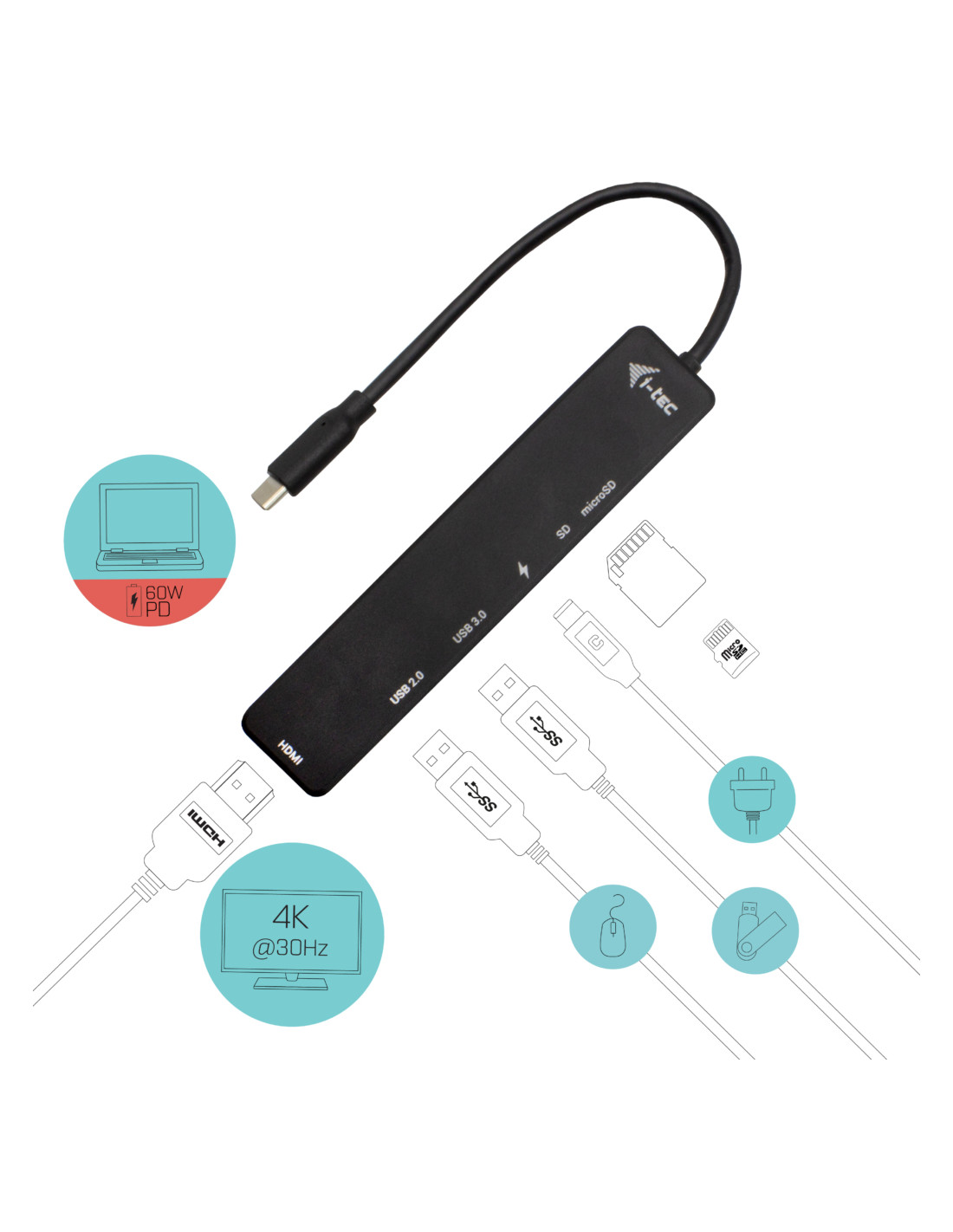 Una piccola docking station che, nonostante le sue dimensioni molto compatte, offre tutto il necessario per il lavoro di base. Collega un monitor esterno con una risoluzione fino a 4K, due porte USB per collegare le tue periferiche e un lettore di schede SD e microSD per facilitare il trasferimento dei dati. Naturalmente, puoi anche alimentare il tuo laptop, fino a 60W (puoi usare il tuo adattatore di corrente esistente o acquistare un caricatore da noi)