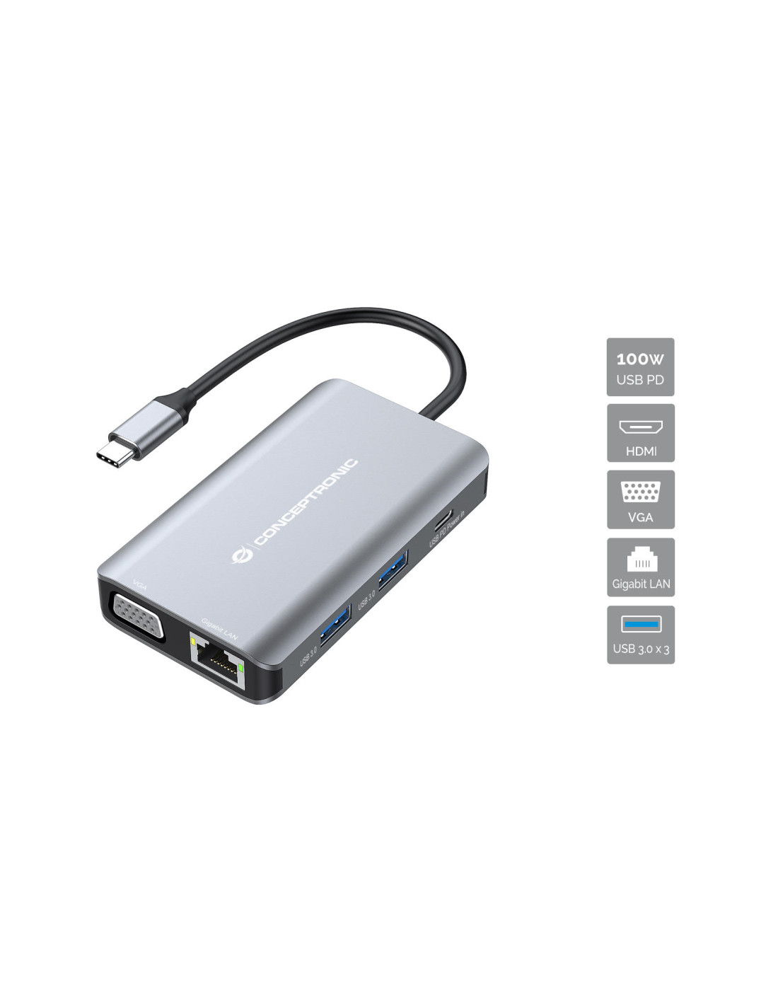 Conceptronic DONN21G. Tecnologia di connessione: Cablato, Interfaccia host: USB 3.2 Gen 1 (3.1 Gen 1) Type-C, Fornitura di alimentazione USB fino a: 100 W. Velocità trasferimento Ethernet LAN: 1000 Mbit/s. Colore del prodotto: Grigio, Tipologia HD: 4K Ultra HD, Risoluzione (digitale massima): 3840 x 2160 Pixel. Lunghezza cavo d'alimentazione: 0,2 m. Sistema operativo Windows supportato: Windows 10, Windows 11, Windows 7, Windows 8, Windows Vista, Windows XP, Compatibilità sistema operativo Mac: Mac OS X 10.10 Yosemite, Mac OS X 10.11 El Capitan, Mac OS X 10.12 Sierra, Mac OS X 10.13 High..., Altri sistemi operativi supportati: Android, ChromeOS
