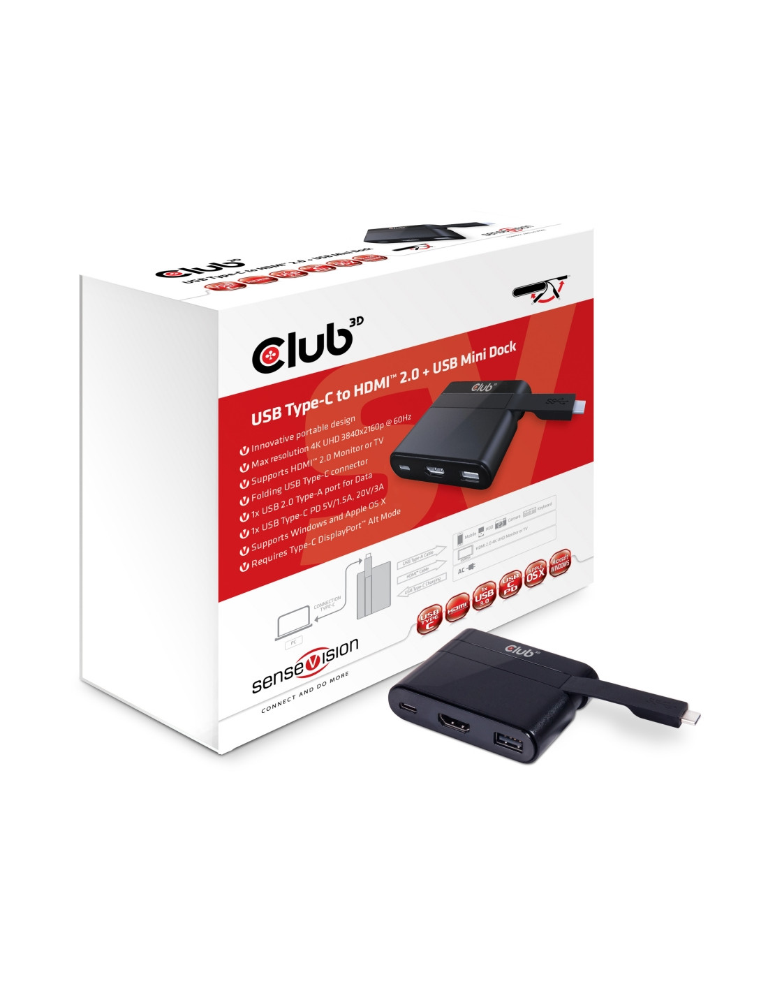 CLUB3D USB Type-C to HDMI™ 2.0 + USB 2.0 + USB Type-C Charging Mini Dock. Tecnologia di connessione: Cablato, Interfaccia host: USB 3.2 Gen 1 (3.1 Gen 1) Type-C. Colore del prodotto: Nero, Paese di origine: Cina. Sistema operativo Windows supportato: Windows 10, Windows 10 Education, Windows 10 Education x64, Windows 10 Enterprise, Windows 10.... Larghezza: 78 mm, Profondità: 19 mm, Altezza: 60 mm. Quantità per pacco: 1 pz, Larghezza imballo: 135 mm, Profondità imballo: 45 mm