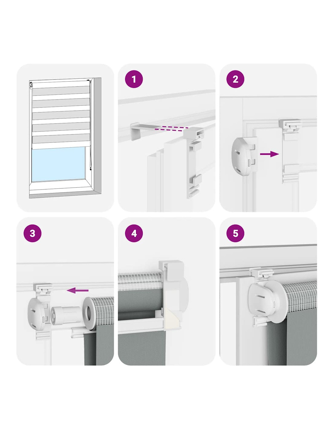 - Due modi di montaggio: A seconda delle esigenze, è possibile fissare la tenda a rullo zebrata alla parete o alla finestra con viti o senza trapano utilizzando staffe di serraggio.