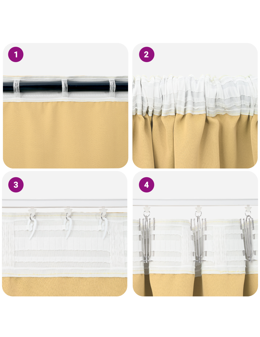 - Opzioni di appendimento versatili: Puoi sistemarle con ganci piccoli, ganci grandi, linguette o tasche per asta, a seconda di cosa preferisci. Questa flessibilità permette un’installazione facile e un miglioramento dell'estetica della tua casa.