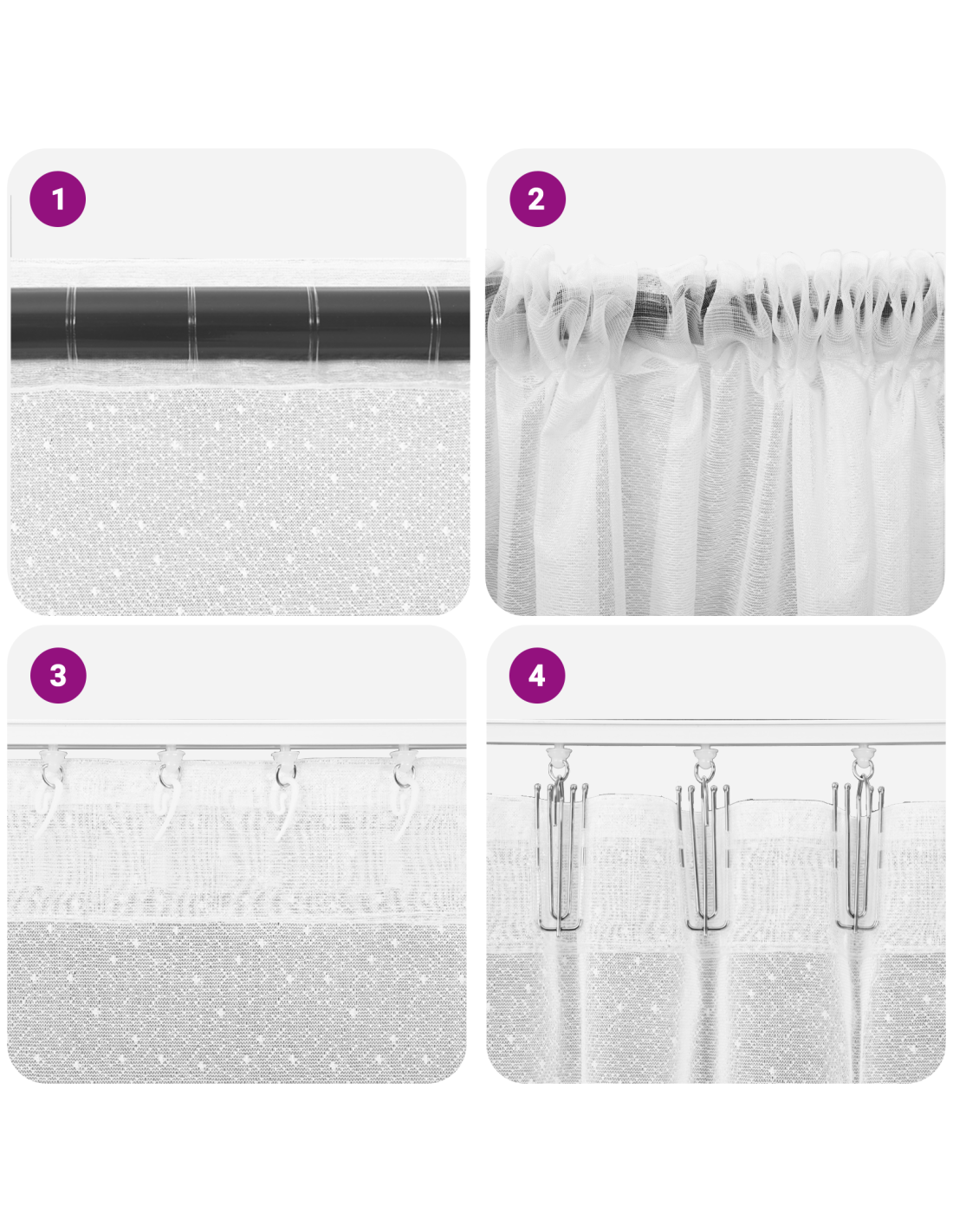 - Caratteristiche / Funzione / Design: Le tende in pizzo offrono diversi metodi di installazione, inclusi ganci piccoli e grandi per una sospensione semplice. Con un taschino per asta e diverse linguette, gli utenti possono scegliere il metodo migliore per le loro finestre. Questo design versatile si integra bene con lo stile moderno e semplice delle tende, grazie al suo look discreto e decorativo.
