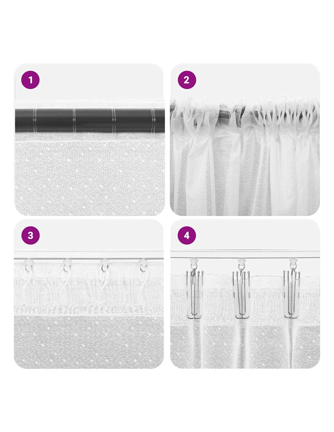 - Caratteristiche / Funzione / Design: Le tende in pizzo offrono diversi metodi di installazione, inclusi ganci piccoli e grandi per una sospensione semplice. Con un taschino per asta e diverse linguette, gli utenti possono scegliere il metodo migliore per le loro finestre. Questo design versatile si integra bene con lo stile moderno e semplice delle tende, grazie al suo look discreto e decorativo.