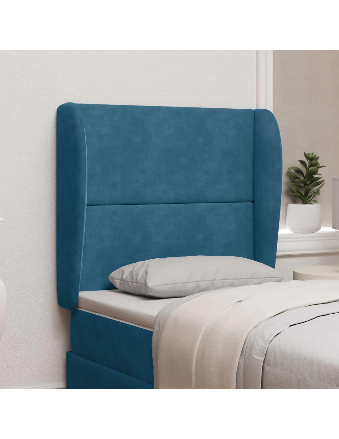 - Finitura in velluto lussuoso La testiera ha una finitura in velluto premium che sprigiona eleganza e raffinatezza. Il materiale non solo conferisce un tocco di lusso alla tua camera, ma offre anche una consistenza morbida per un'accogliente esperienza di relax. Il suo ricco blu aggiunge vivacità, completando gli interni moderni.