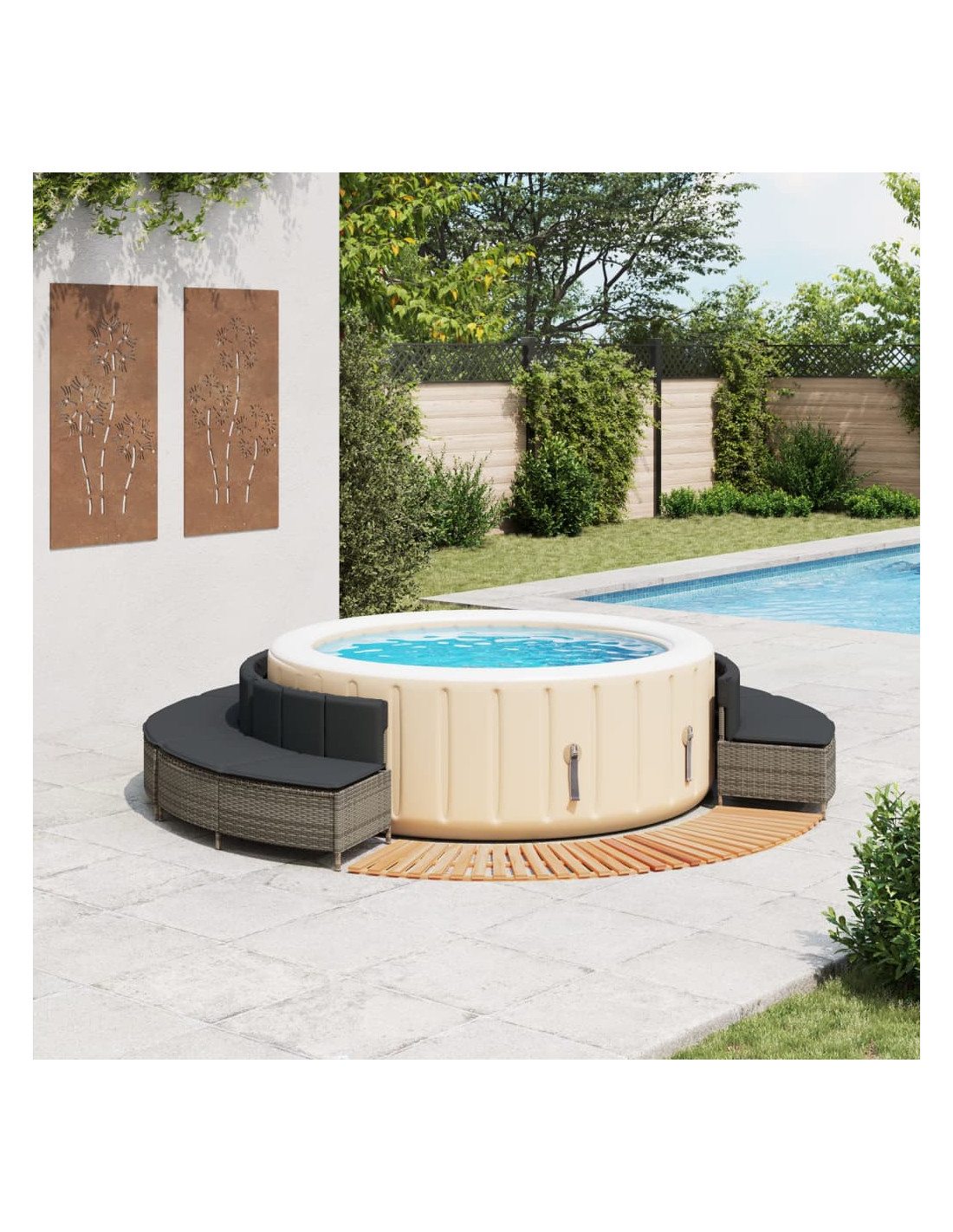 - Design a doghe: il bordo in legno per vasca idromassaggio presenta un design a doghe che facilita il drenaggio e aggiunge un tocco di fascino naturale alla zona circostante la vasca idromassaggio.