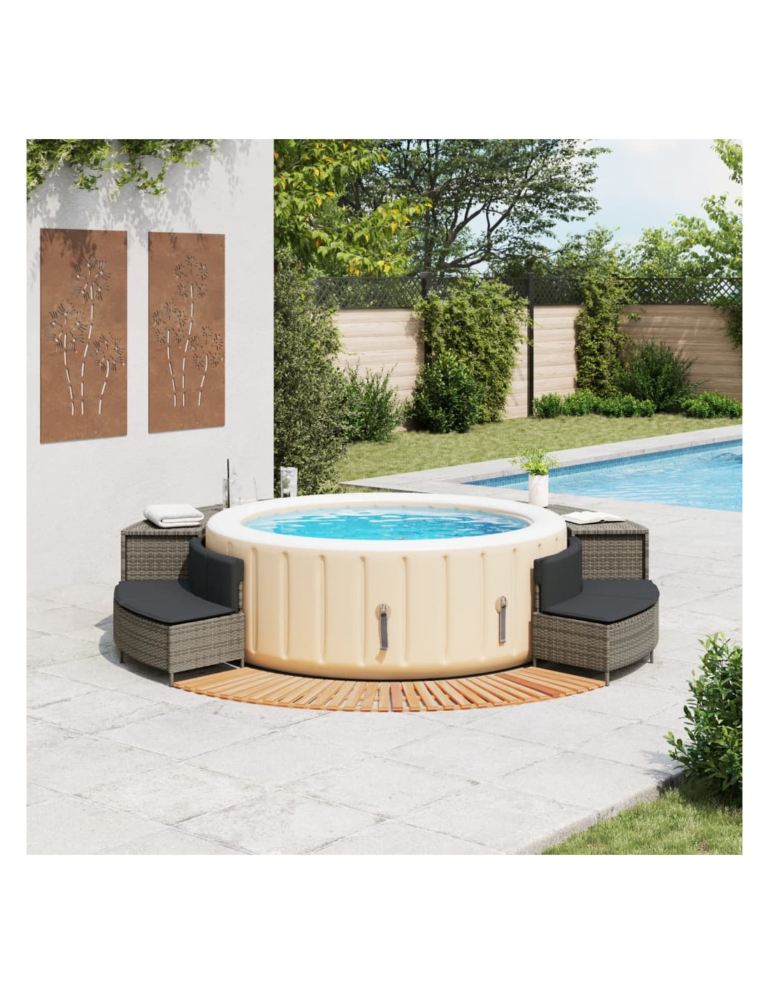 - Design a doghe: il bordo in legno per vasca idromassaggio presenta un design a doghe che facilita il drenaggio e aggiunge un tocco di fascino naturale alla zona circostante la vasca idromassaggio.
