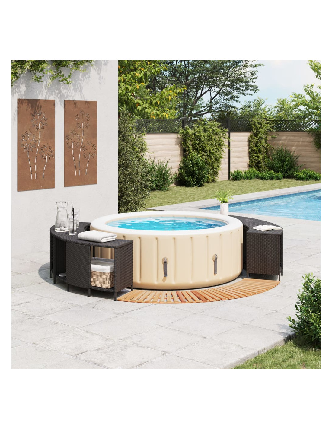 - Design a doghe: il bordo in legno per vasca idromassaggio presenta un design a doghe che facilita il drenaggio e aggiunge un tocco di fascino naturale alla zona circostante la vasca idromassaggio.