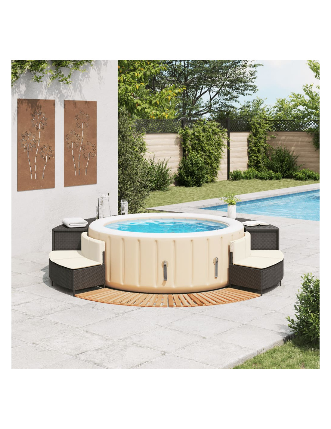 - Design a doghe: il bordo in legno per vasca idromassaggio presenta un design a doghe che facilita il drenaggio e aggiunge un tocco di fascino naturale alla zona circostante la vasca idromassaggio.