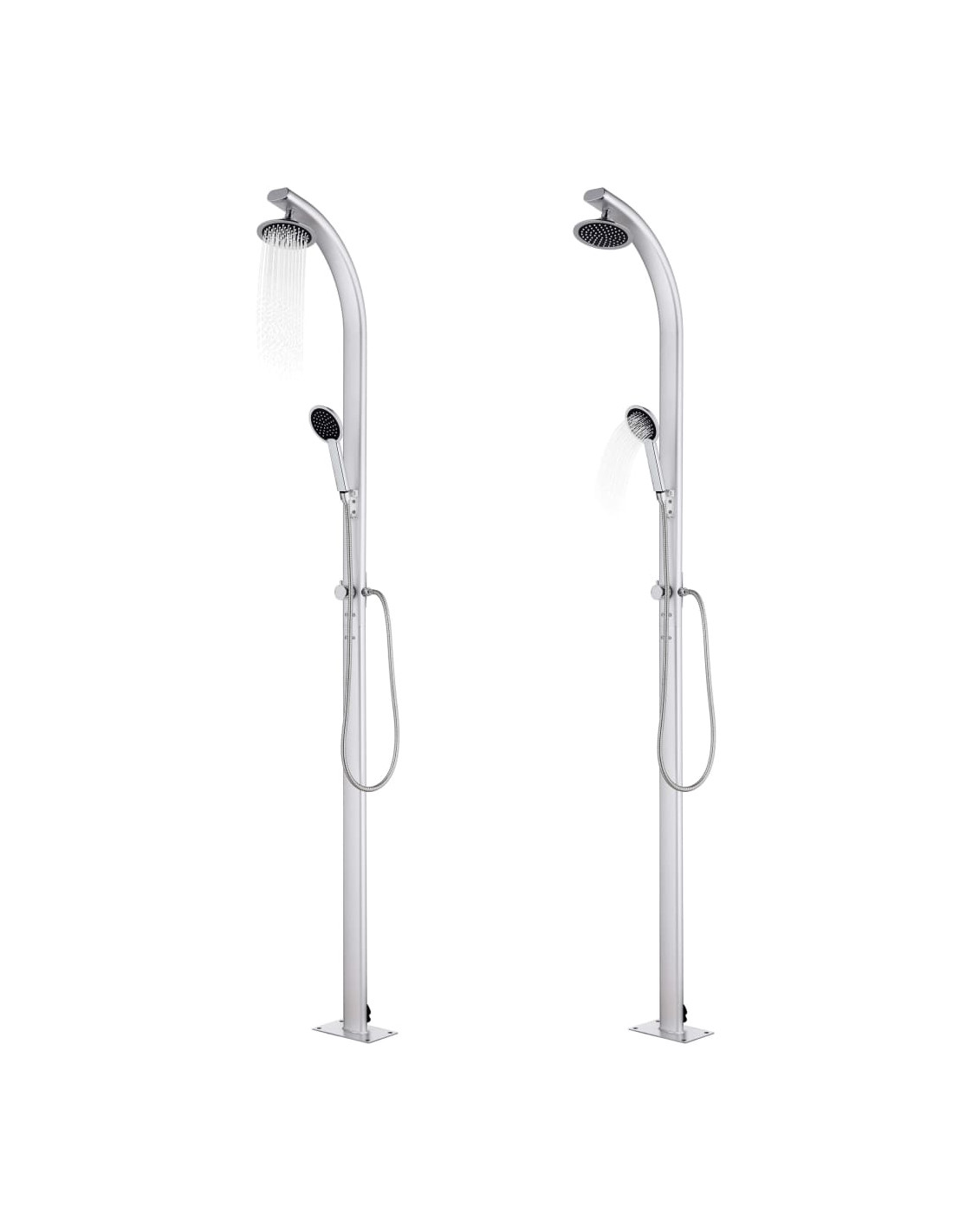 Questa doccia per esterni è stata realizzata in alluminio che la rende resistente agli agenti atmosferici. Il sistema doccia è dotato di soffione e doccetta per soddisfare le vostre esigenze nell'ambito del giardinaggio, dell'irrigazione o per una doccia veloce. La doccetta è dotata di un tubo flessibile a doppia chiusura con una lunghezza di 1,5 m. E' inoltre dotata di supporto per doccetta utilizzabile anche per appoggiare l'asciugamano.