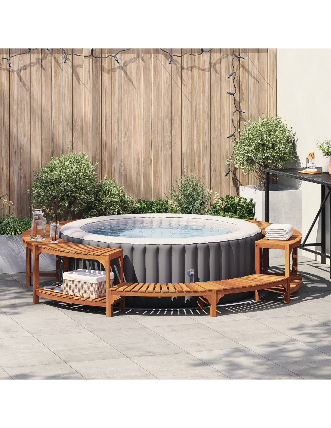 Questo rivestimento moderno per la vasca idromassaggio è fatto di legno massello di acacia e aggiunge un tocco di bellezza e resistenza al tuo spazio esterno. Il suo design circolare avvolge la vasca in modo elegante, creando un'atmosfera accogliente e fluida che si abbina a vari stili all'aperto. È perfetto per dare un tocco in più al tuo giardino, aggiungendo funzionalità e stile in un colpo solo, così puoi rilassarti con eleganza mentre ti godi la natura. La tonalità marrone aggiunge calore e un pizzico di classe al tuo patio o giardino, trasformando il tuo spazio all'aperto in un angolo di relax.