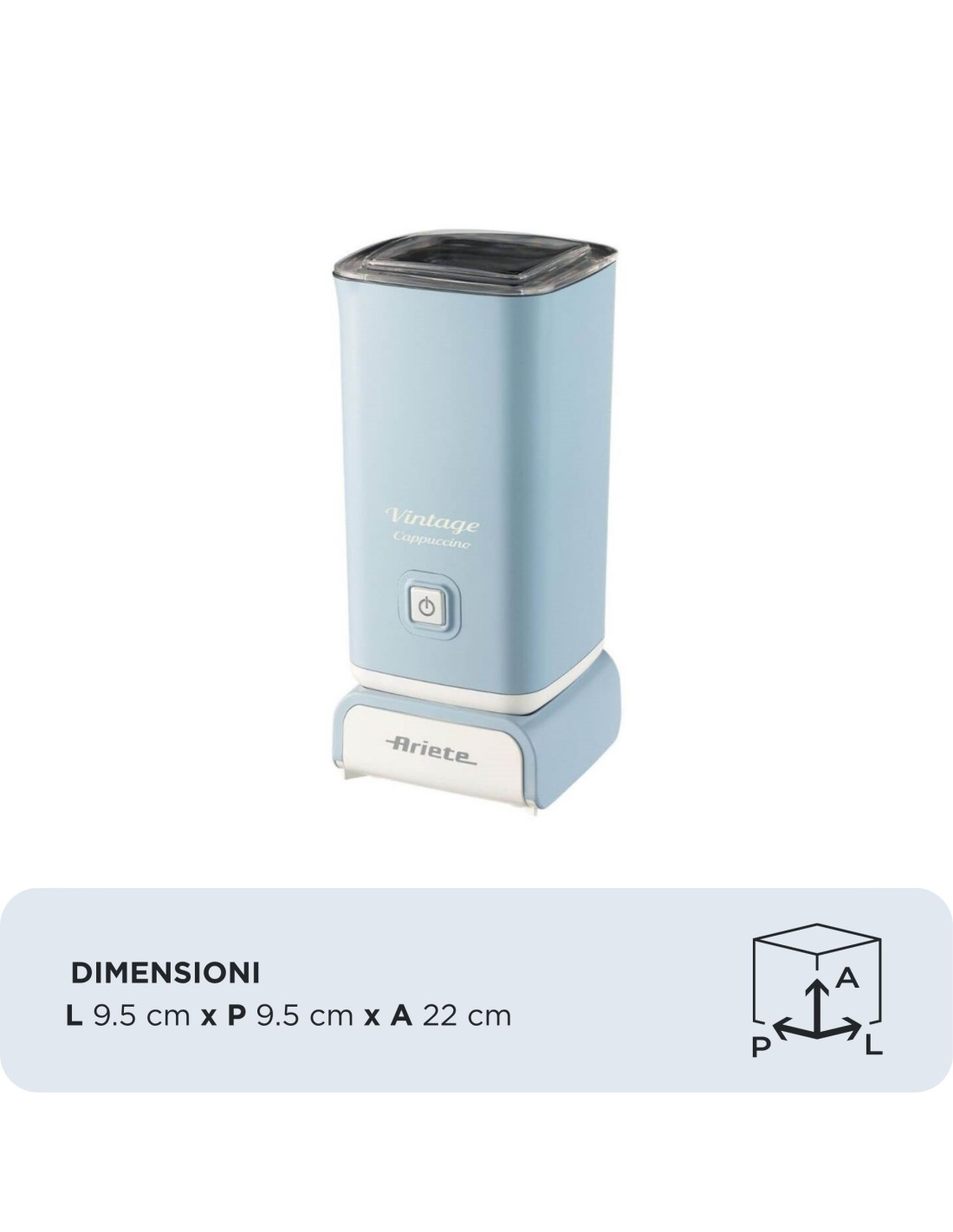 Se la mattina non puoi rinunciare alla cremosità di un cappuccino appena fatto, allora il Cappuccinatore Vintage è quello che fa per te. Sì, perché fare il cappuccino a casa non è mai stato così semplice grazie al montalatte elettrico Ariete, dal design Vintage e colorato, per colazioni a casa come al bar. Con cappuccinatore Vintage avrai in soli 2 minuti una schiuma di latte calda o fredda, utilizzando un unico pulsante. Con montalatte Vintage Avrai inoltre a disposizione due diversi accessori: uno per montare il latte e l’altro per mescolare tutti gli ingredienti che preferisci per creare frullati e smoothie di frutta e verdura: lo schiumalatte ideale per la tua cucina!Il Cappuccinatore Vintage non sarà solo il tuo migliore amico per la prima colazione, ma anche un prodotto home decor che ti piacerà mostrare in cucina, grazie al suo stile shabby chic e alle forme romantiche. Potrai scegliere il tuo cappuccinatore fra 3 diversi colori pastello (beige, verde e celeste) quello che più si intona ai tuoi gusti e al tuo stile in cucina.