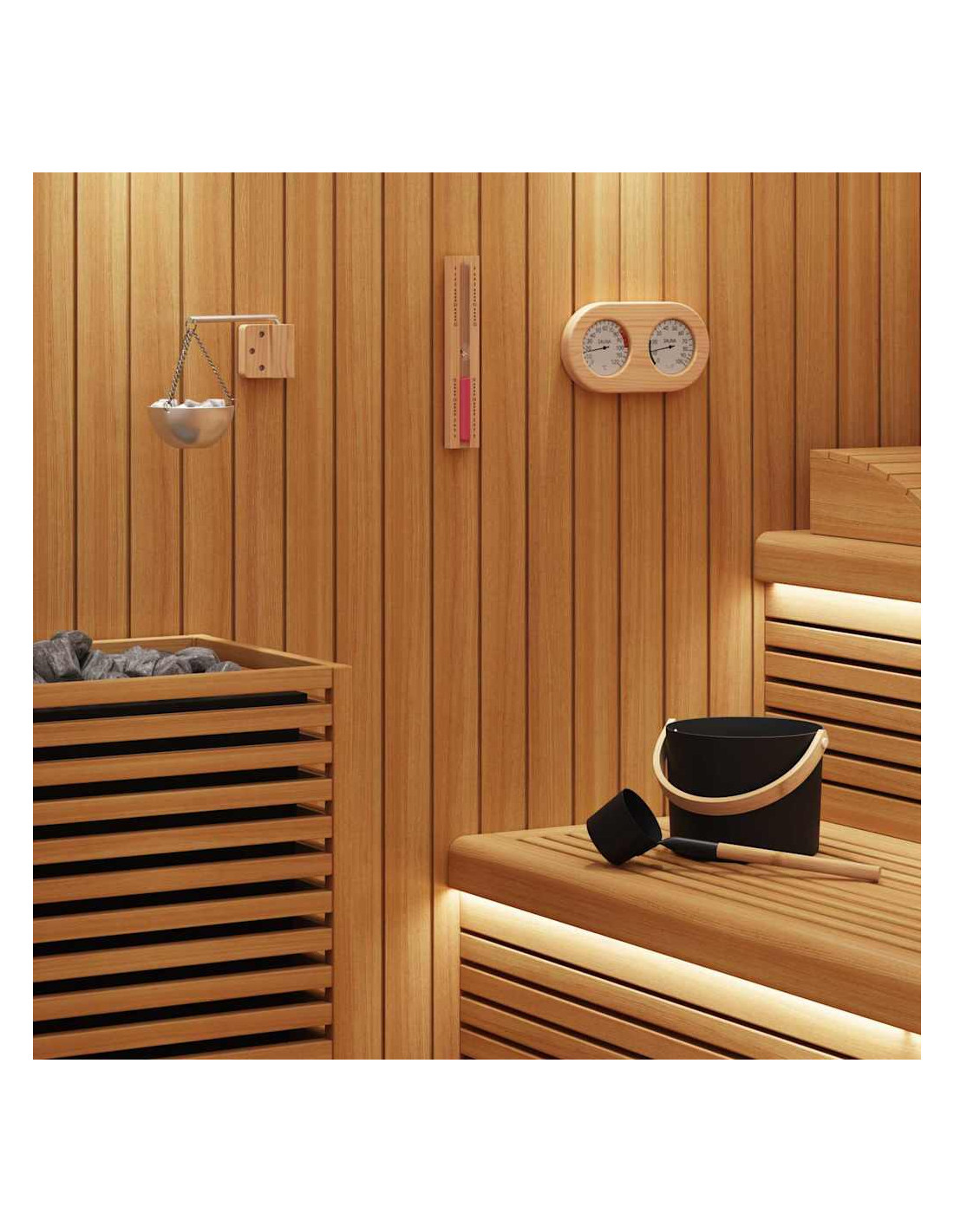 - Uso nella sauna interna Questo set, pensato solo per uso interno, è un'aggiunta ideale per le saune, migliorando l'esperienza di relax e fornendo uno strumento utile e stiloso per versare acqua e creare vapore, arricchendo le tue sessioni di sauna.