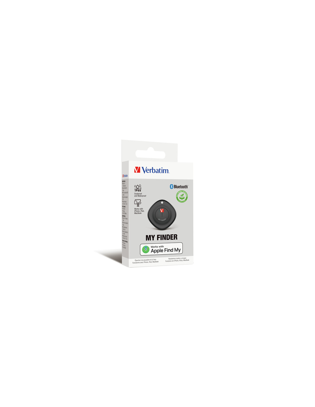 Verbatim My Finder. Utilizzo: Personale, Tipo di prodotto: Cercatore, Colore del prodotto: Nero. Versione USB: 3.2 Gen 1 (3.1 Gen 1). Tipo batteria: CR2032. Sistema operativo mobile supportato: iOS. Peso: 13 g, Larghezza: 43 mm, Profondità: 44 mm