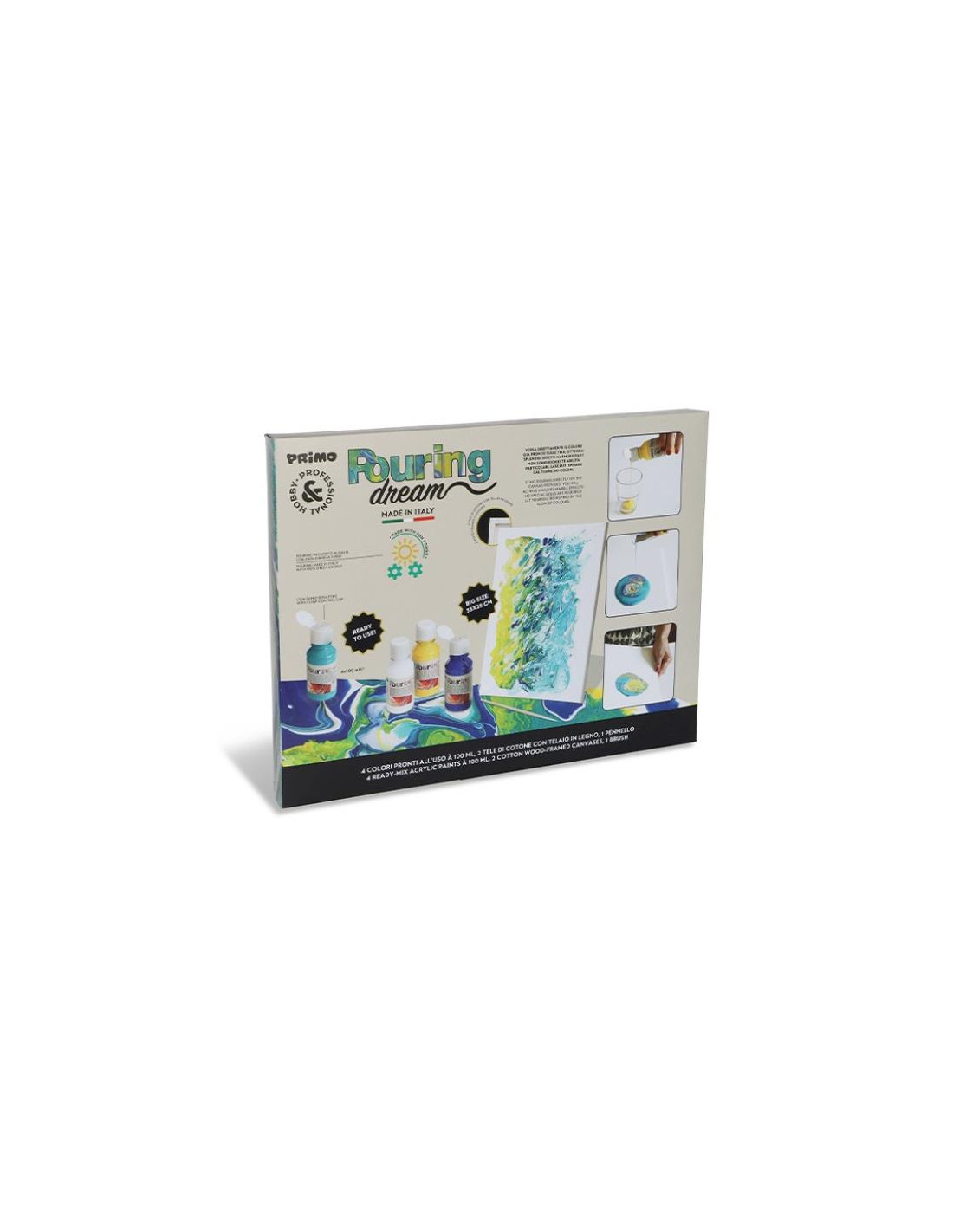 set Pouring pronto all uso con 4 colori acrilici per pouring da 100ml 2 tela con telaio 25x35cm un pennello sintetico