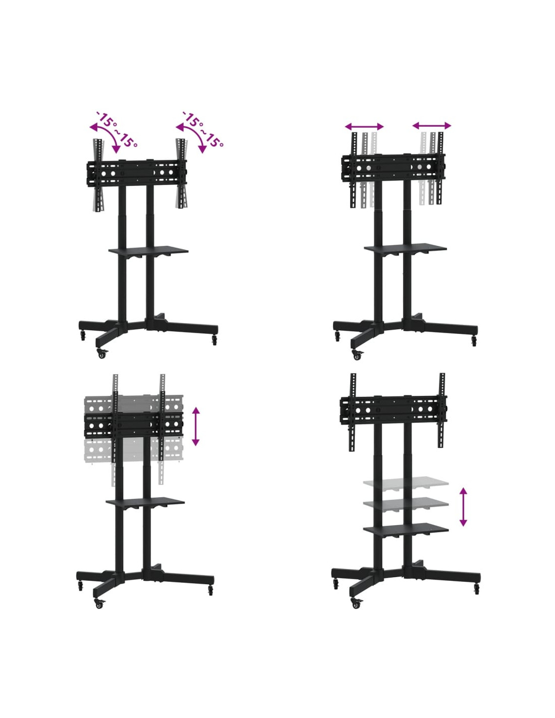 - Funzione di inclinazione: Questo supporto TV è dotato di una funzione di inclinazione che consente di inclinarlo di 15° verso l'alto e verso il basso per evitare abbagliamenti e ridurre lo sforzo sul collo o sugli occhi.