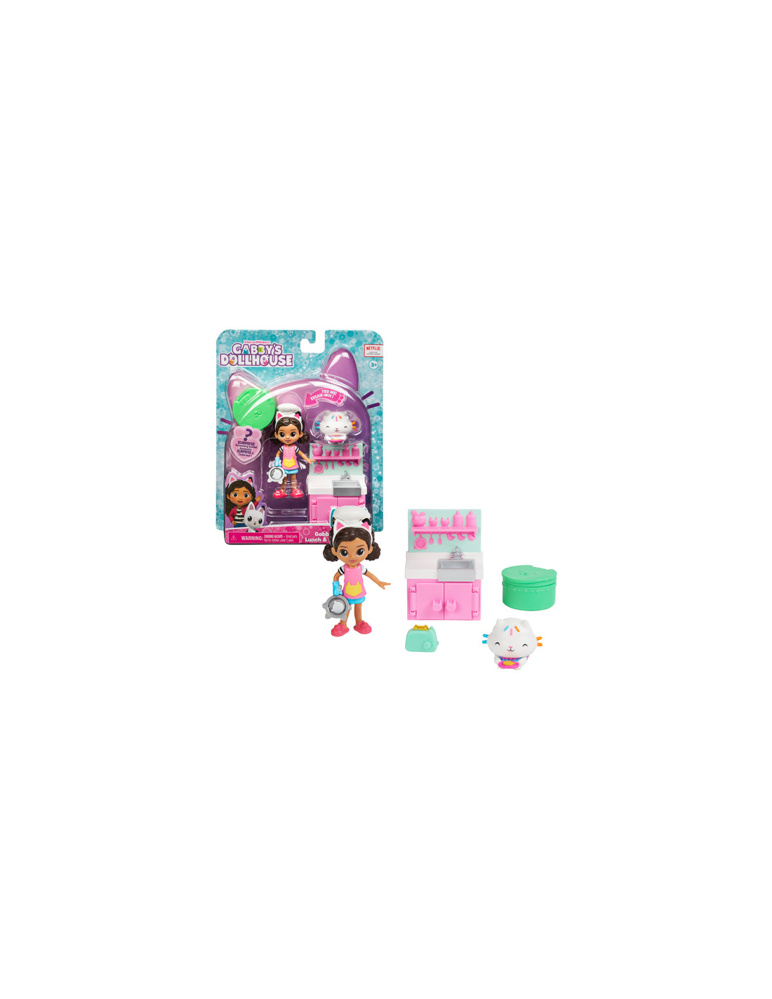 Include: 1 personaggio Gabby, 1 personaggio Cakey Cat, 1 mobile, 1 scatola con sorpresa, 1 accessorio