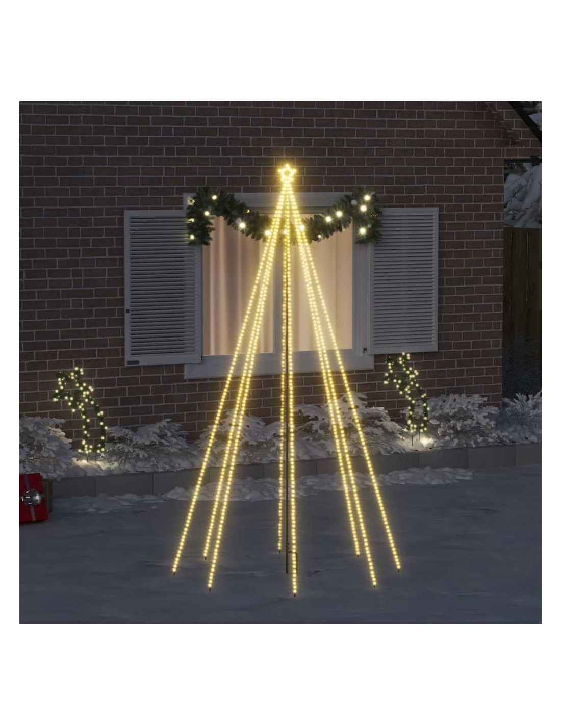Questa luce con design a cascata è pre-illuminata con 400 LED in 8 stringhe e ha una stella artigianale in cima. Sono anche a risparmio energetico, extra luminosi e di lunga durata. Include una prolunga super lunga da 10 m che è abbastanza lunga per il collegamento esterno. Le linee principali e i trefoli hanno una classificazione IP44, che è impermeabile. Il palo supporto centrale e i picchetti di terra sono inclusi nella consegna per essere appesi e fissati facilmente.