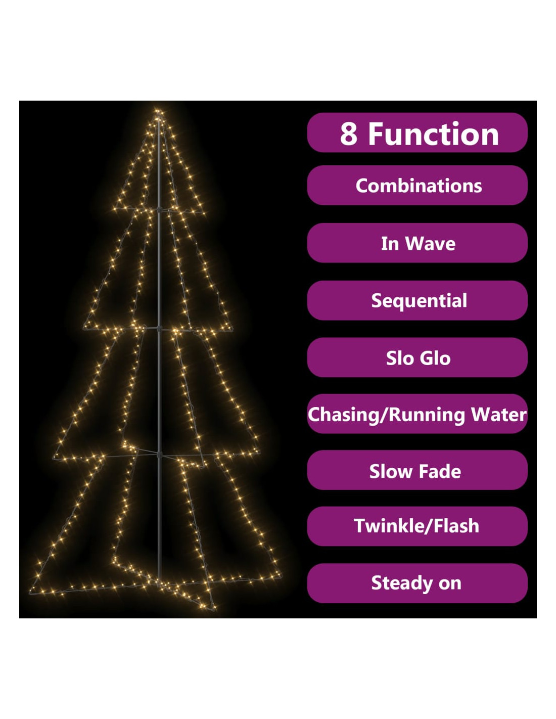 Le luci sono costituite da 360 LED ad alta potenza, che sono molto efficienti dal punto di vista energetico ed emettono una luce brillante. Progettato con luci con 8 effetti diversi: una combinazione di tutti gli effetti, bagliore lento, scintillio/flash, in onda, inseguimento/acqua corrente, sequenziale, accensione fissa e dissolvenza lenta, si illumina magnificamente e crea una magica atmosfera di vacanza. Attirerà certamente l'attenzione di tutti, soprattutto la sera, e può essere anche utilizzata come fonte luminosa per rendere maggiormente accogliente l'ambiente. L'albero a cono autoportante può essere fissato facilmente e in modo sicuro al terreno con i materiali di montaggio inclusi.