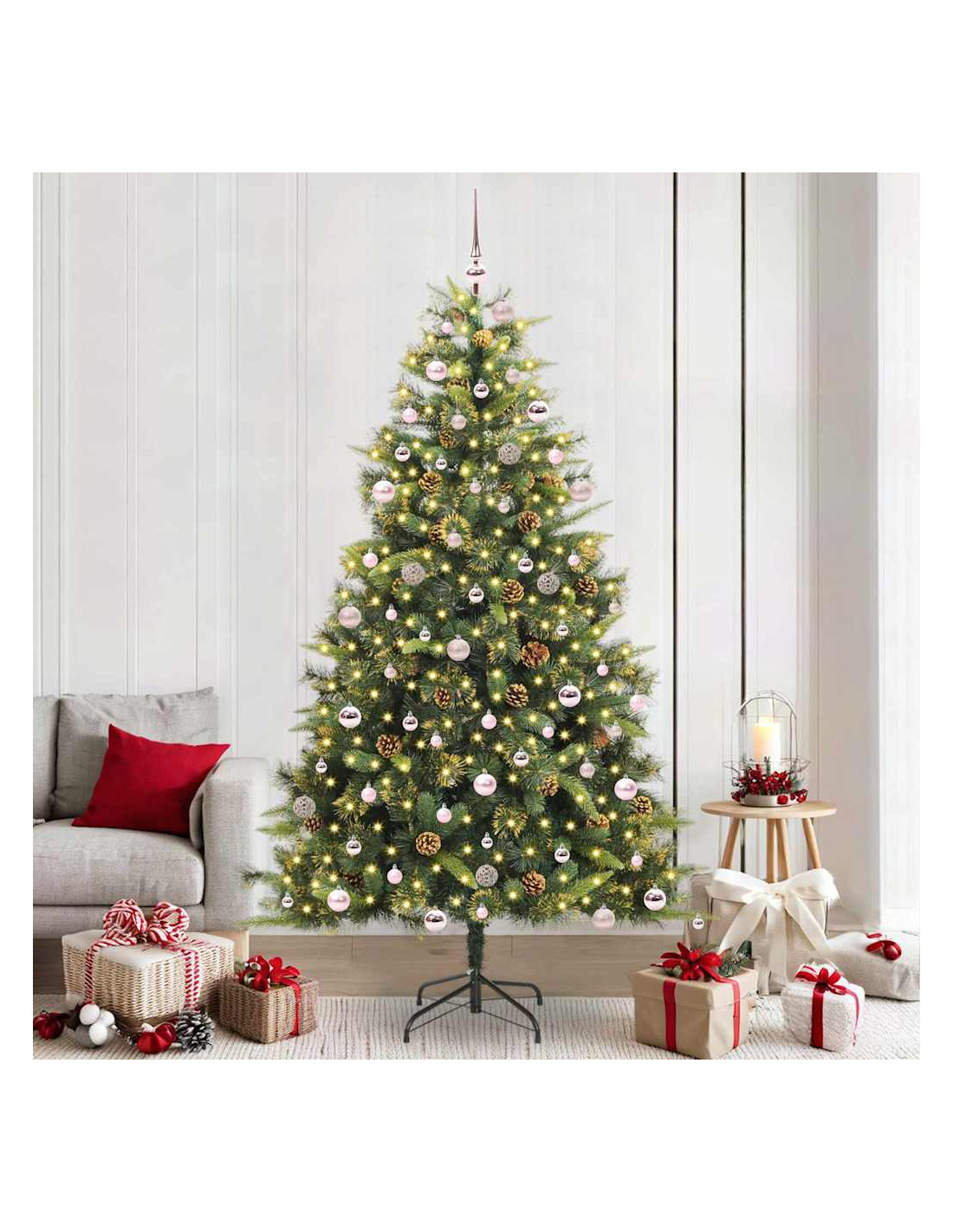 - Usi Raccomandati: Perfetto per interni ed esterni, l'albero abbellisce soggiorni, terrazzi e qualsiasi altro spazio in modo festivo. La sua forma slanciata lo rende adatto anche per spazi più ristretti, ideale per appartamenti.