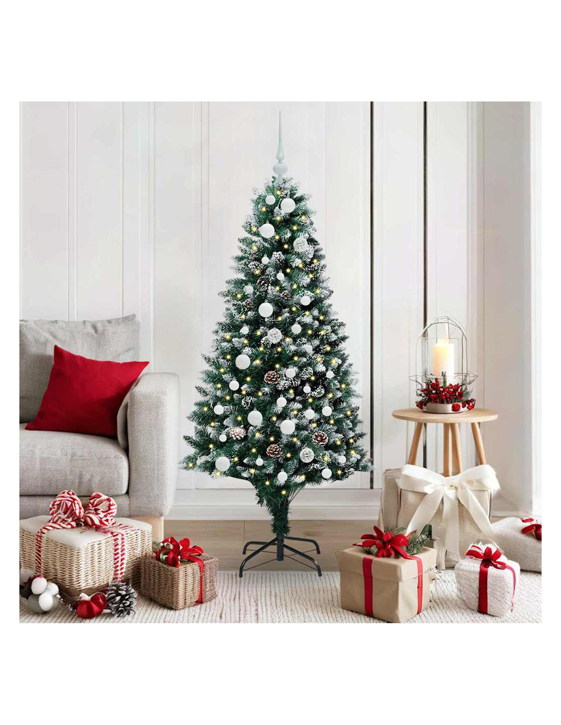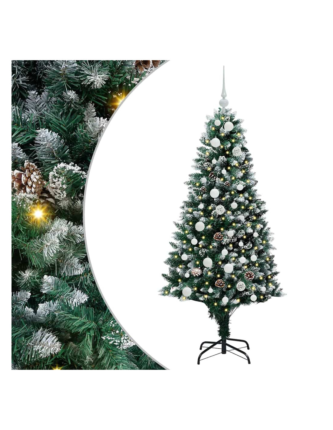 L'albero di Natale artificiale in PVC unisce il fascino del Natale con la comodità delle luci LED moderne. È progettato per interni e spazi esterni riparati, con una forma conica, pigne e neve bianca che creano un'atmosfera magica nel tuo soggiorno, giardino o terrazza. Questo albero stagionale porta lo spirito del Natale in ogni ambiente.