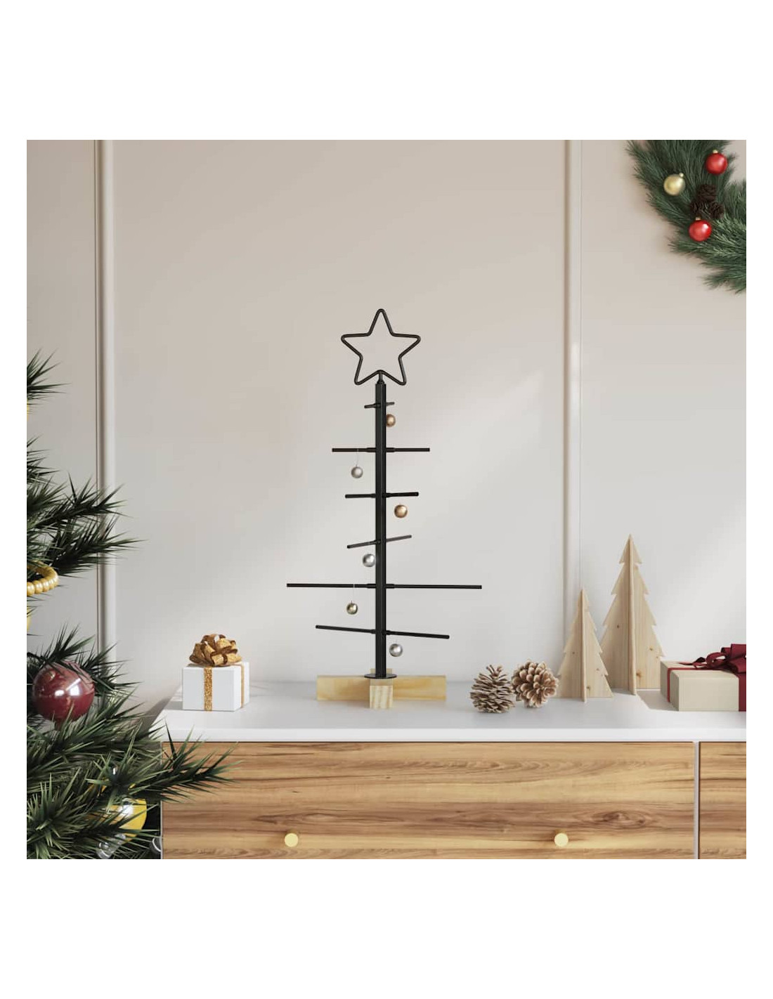- Supporto in Pino Massello: A completare l'elegante albero in acciaio c'è un supporto in legno di pino massello, pensato per dare stabilità e un fascino rustico. Il contrasto tra il metallo nero e il marrone naturale del pino rende il tutto molto accattivante, mantenendo l'albero ben saldo in posizione. Questa combinazione assicura che l'albero rimanga in piedi durante tutta la stagione natalizia, dando tranquillità a chi lo possiede.