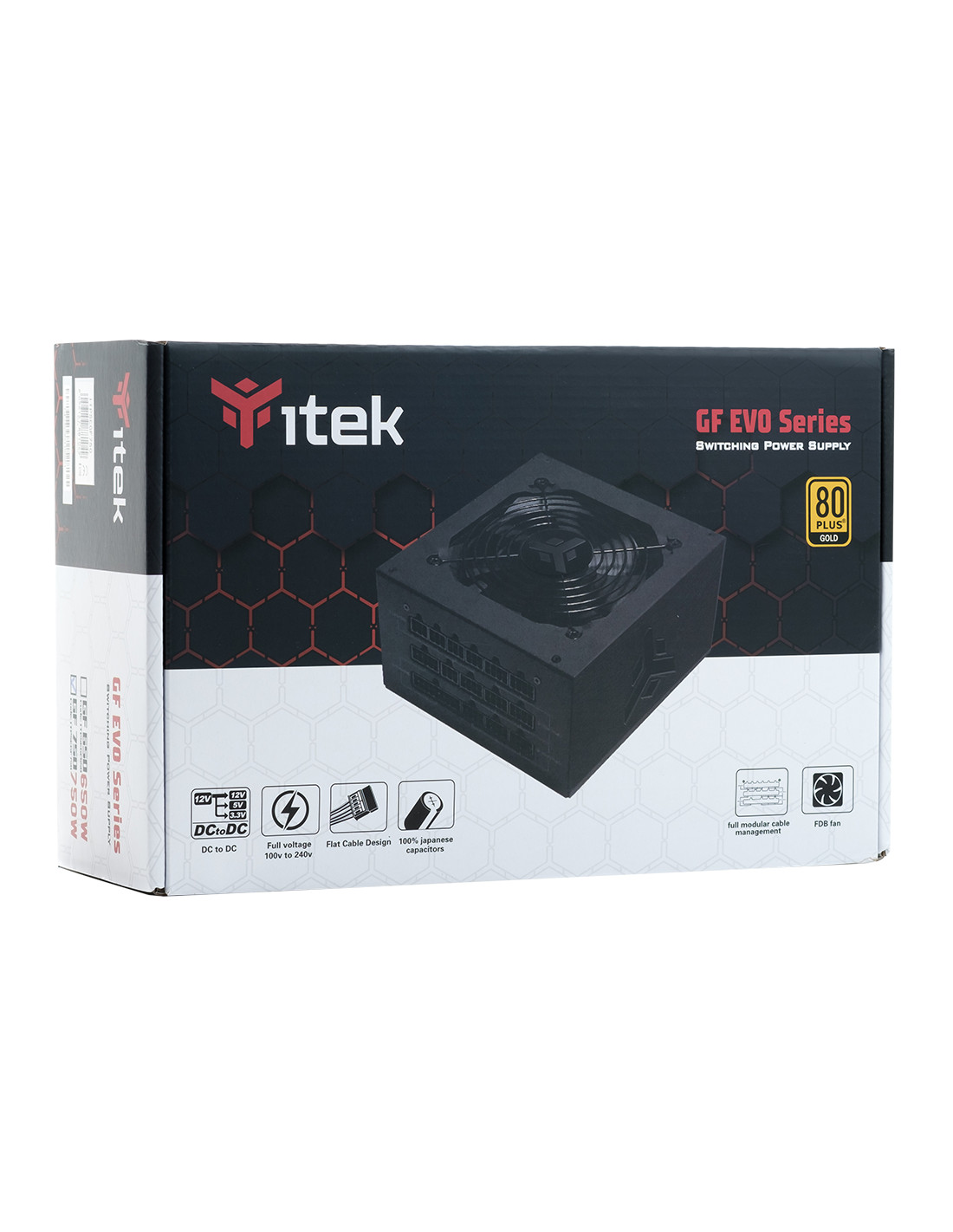 Gli alimentatori della serie GF sono il TOP di gamma di itek. Disponibili con potenze da 650W, 750W e 850W e un efficienza del 90% al 50% di carico, la quale ha permesso di ottenere la prestigiosa certificazione 80Plus® Gold. Questi PSU, con regolazione DC to DC, completamente modulari “free plug”, sono dotati di PFC attivo e dispongono di comodi cavi flat, di una ventola silenziosa da 120mm FDB “Fluid Dynamic Bearing” con controllo termico, di chassis con effetto “ruvido” anti graffio e di condensatori Giapponesi 105c. Tutti dettagli che rendono questi alimentatori estremamente affidabili, silenziosi e di ottima qualità.