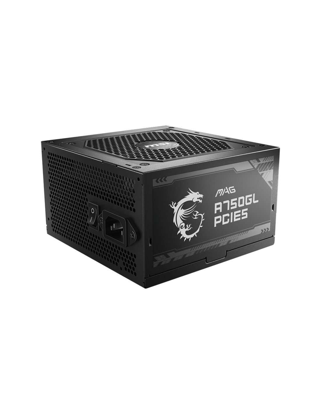 MSI MAG A750GL PCIE5. Potenza totale: 750 W, Tensione di ingresso AC: 100 - 240 V, Frequenza di ingresso AC: 47 - 63 Hz. Connettore scheda madre: 20+4 pin ATX, Lunghezza del cavo di alimentazione della scheda madre: 45 cm, Tipo di cablaggio: Totalmente Modulare. Utilizzo: PC, Fattore di forma dell'unità di alimentazione (PSU): ATX, Certificazione 80 PLUS: 80 PLUS Gold. Colore del prodotto: Nero, Tipo di raffreddamento: Attivo, Diametro del ventilatore: 12 cm. Larghezza: 150 mm, Profondità: 140 mm, Altezza: 86 mm