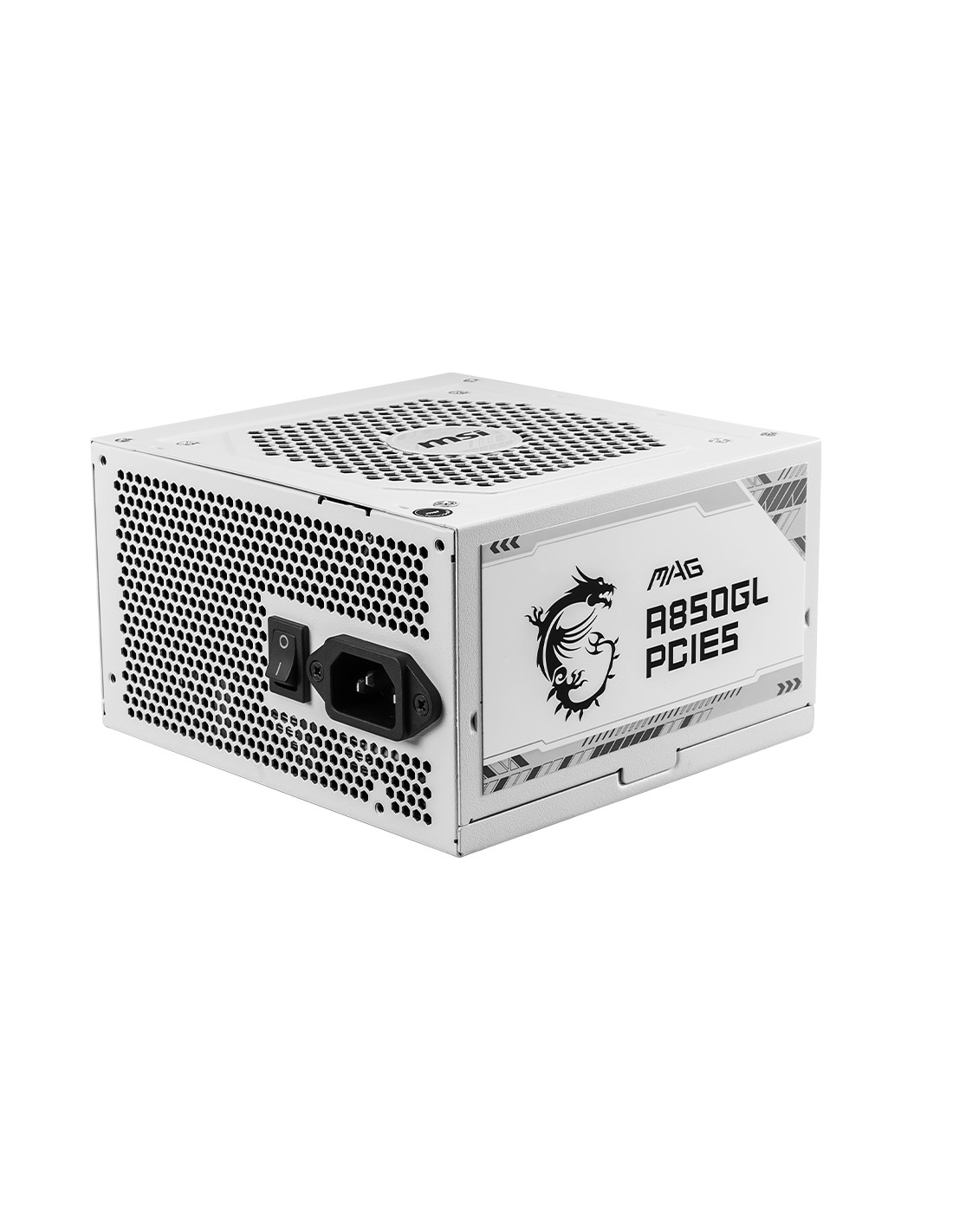MSI MAG A850GL PCIE5 WHITE. Potenza totale: 850 W, Tensione di ingresso AC: 100 - 240 V, Frequenza di ingresso AC: 47 - 63 Hz. Connettore scheda madre: 20+4 pin ATX, Lunghezza del cavo di alimentazione della scheda madre: 60 cm, Tipo di cablaggio: Totalmente Modulare. Utilizzo: PC, Fattore di forma dell'unità di alimentazione (PSU): ATX, Certificazione 80 PLUS: 80 PLUS Gold. Colore del prodotto: Bianco, Tipo di raffreddamento: Attivo, Diametro del ventilatore: 12 cm. Tipo di imballo: Scatola