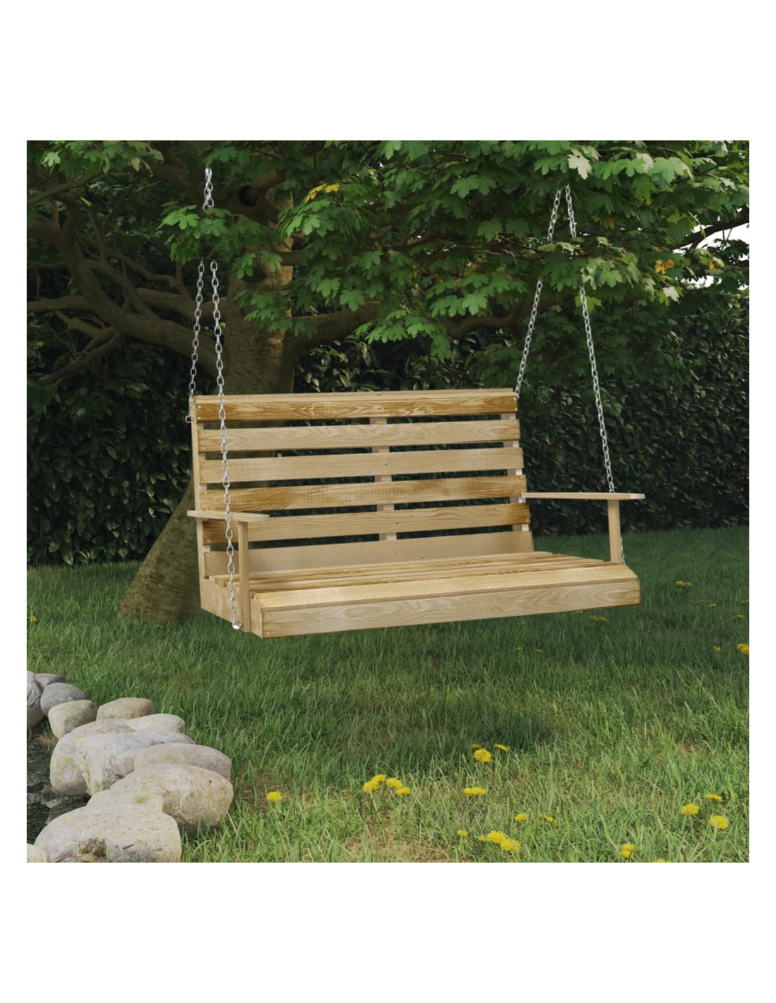 Questa panca a dondolo in legno è la scelta perfetta se state cercando relax e divertimento negli spazi esterni. Questa sedia a dondolo è realizzata in legno massello di pino. Il legno di pino impregnato è robusto, resistente alle intemperie e alla corrosione, il che lo rende adatto all'uso quotidiano all'aperto. Potete appendere il sedile a un albero con le catene incluse. Amerete dondolarvi su questa panchina con una leggera brezza. Nota: il legno è un prodotto naturale e potrebbe presentare lievi imperfezioni. Il telaio di sostegno non è incluso. Vi consigliamo di appendere il dondolo su grandi alberi, supporti e altri oggetti robusti.