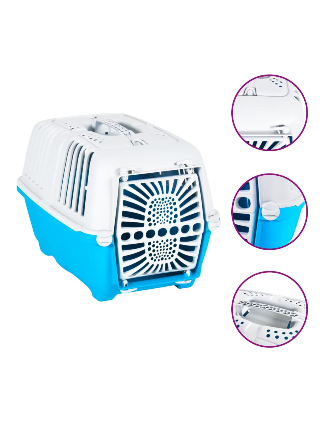 - Serrature sicure: La doppia serratura di sicurezza consente di aprire e chiudere la porta in modo rapido e sicuro. Le chiusure a scatto assicurano che la parte superiore e quella inferiore della gabbia da viaggio siano fissate saldamente l'una all'altra.