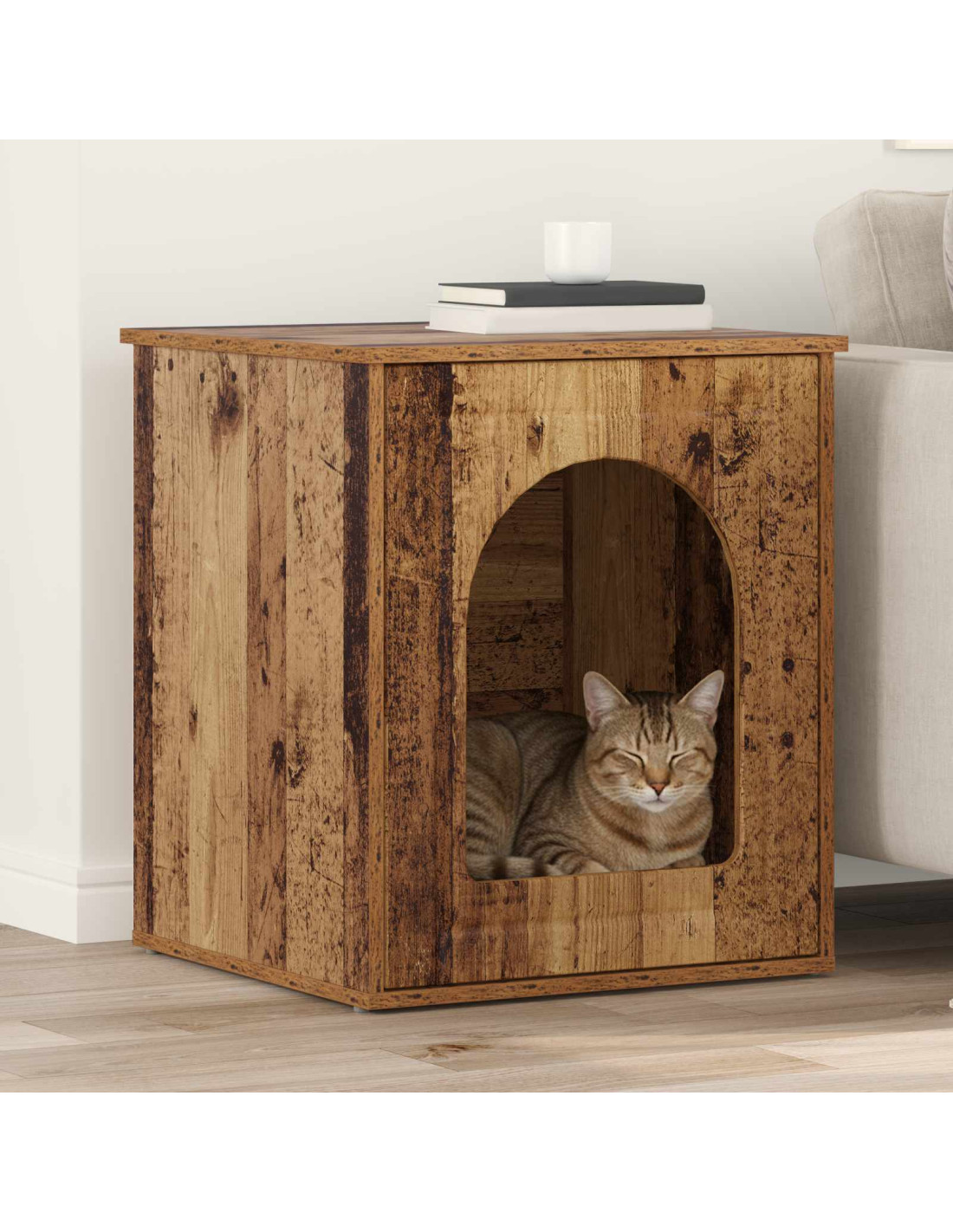 - Materiale: Realizzata in legno ingegnerizzato, resistente e uniforme. Questo materiale duraturo assicura un uso prolungato senza compromettere il design elegante, rendendola ideale per gli interni moderni. Resiste all'usura quotidiana e mantiene un aspetto raffinato, creando un rifugio accogliente per il tuo gatto.