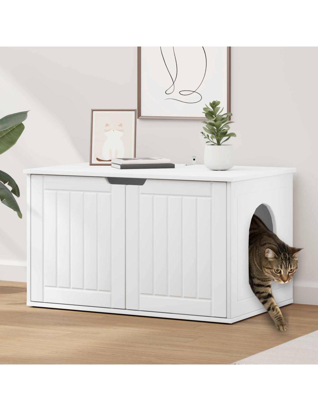 Questa casa per gatti è un'aggiunta super elegante per qualsiasi soggiorno. Semplice e funzionale, è una soluzione chic per chi ama l'estetica. La forma rettangolare ben si adatta anche agli angoli o contro le pareti, permettendo di sfruttare al meglio lo spazio. Le linee pulite e senza fronzoli la fanno diventare il rifugio perfetto per gli animali, che si inserisce senza sforzo negli spazi moderni. Non solo offre comfort al tuo gatto, ma valorizza anche la tua casa con un tocco di classe.