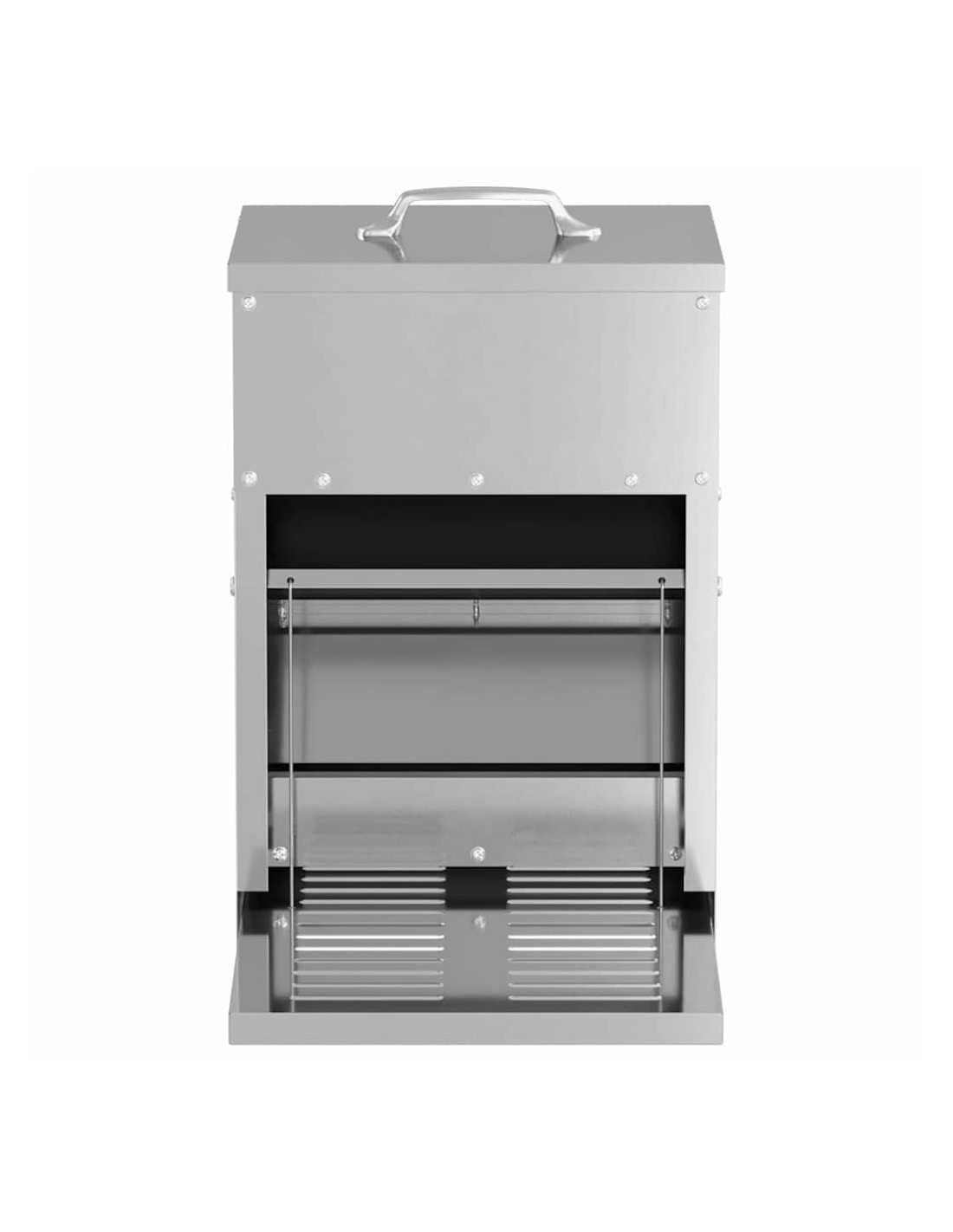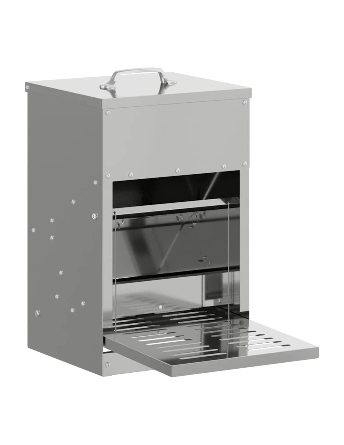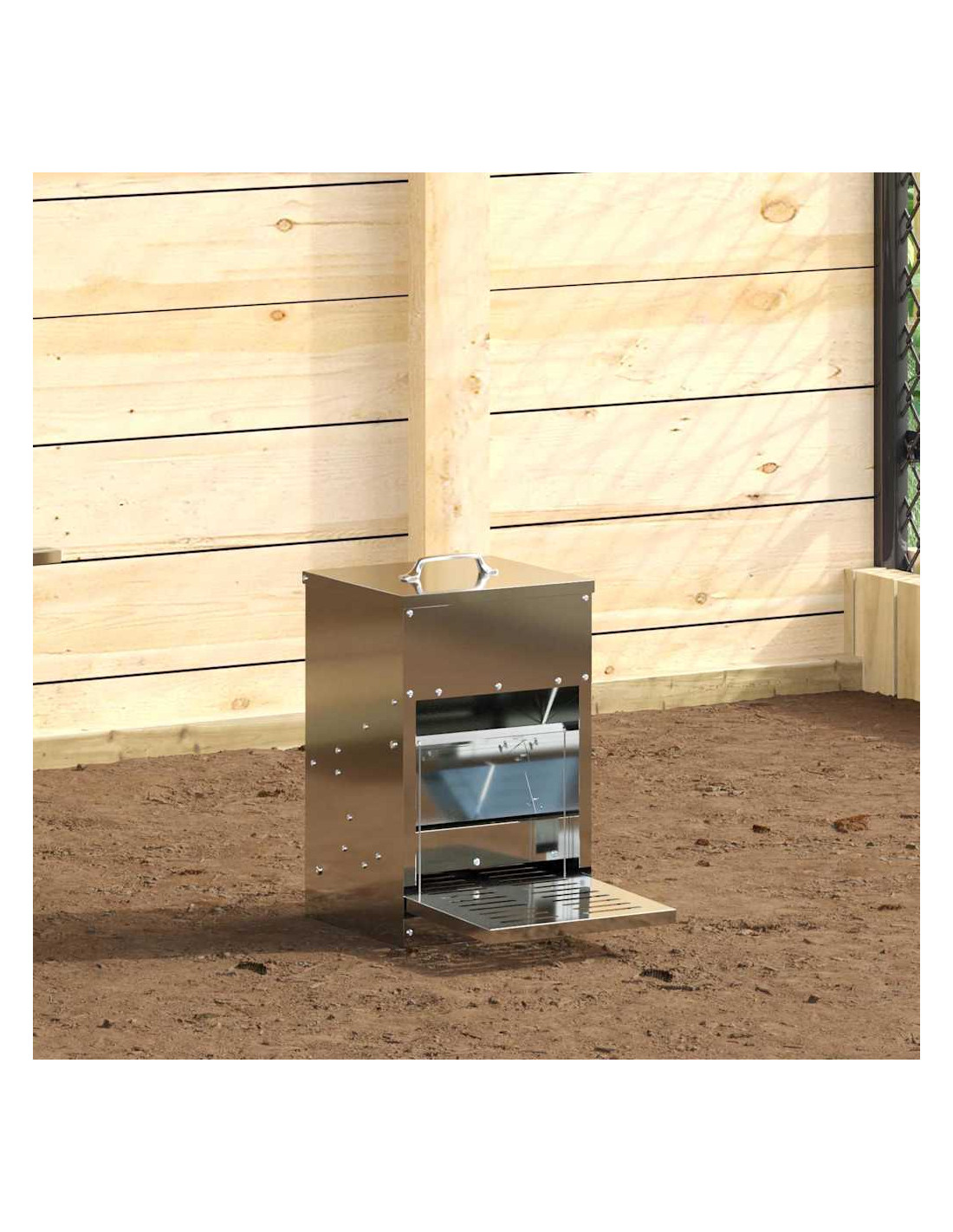 - Design moderno in acciaio: Realizzata in acciaio resistente, questa mangiatoia è fatta per durare e si adatta perfettamente a vari ambienti, sia interni che esterni.