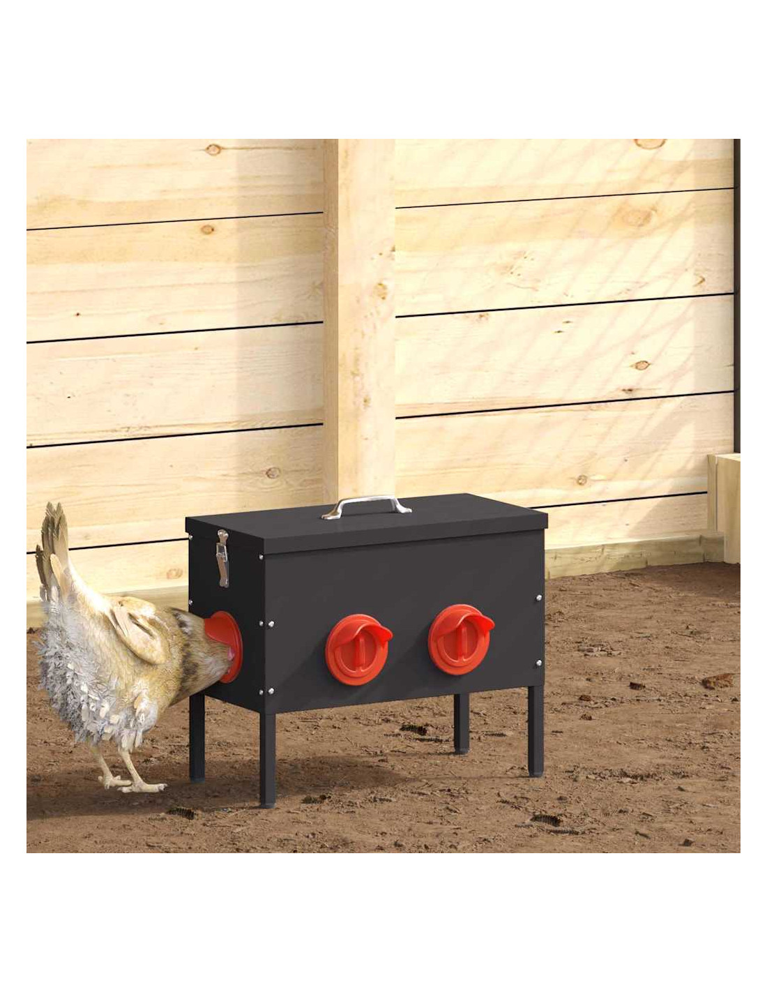 - Adattabilità interna ed esterna: La mangiatoia si adatta facilmente sia all'interno che all'esterno, offrendo versatilità nel posizionamento. Perfetta per un pollaio in giardino o un ricovero al chiuso, soddisfa diverse necessità di alimentazione.