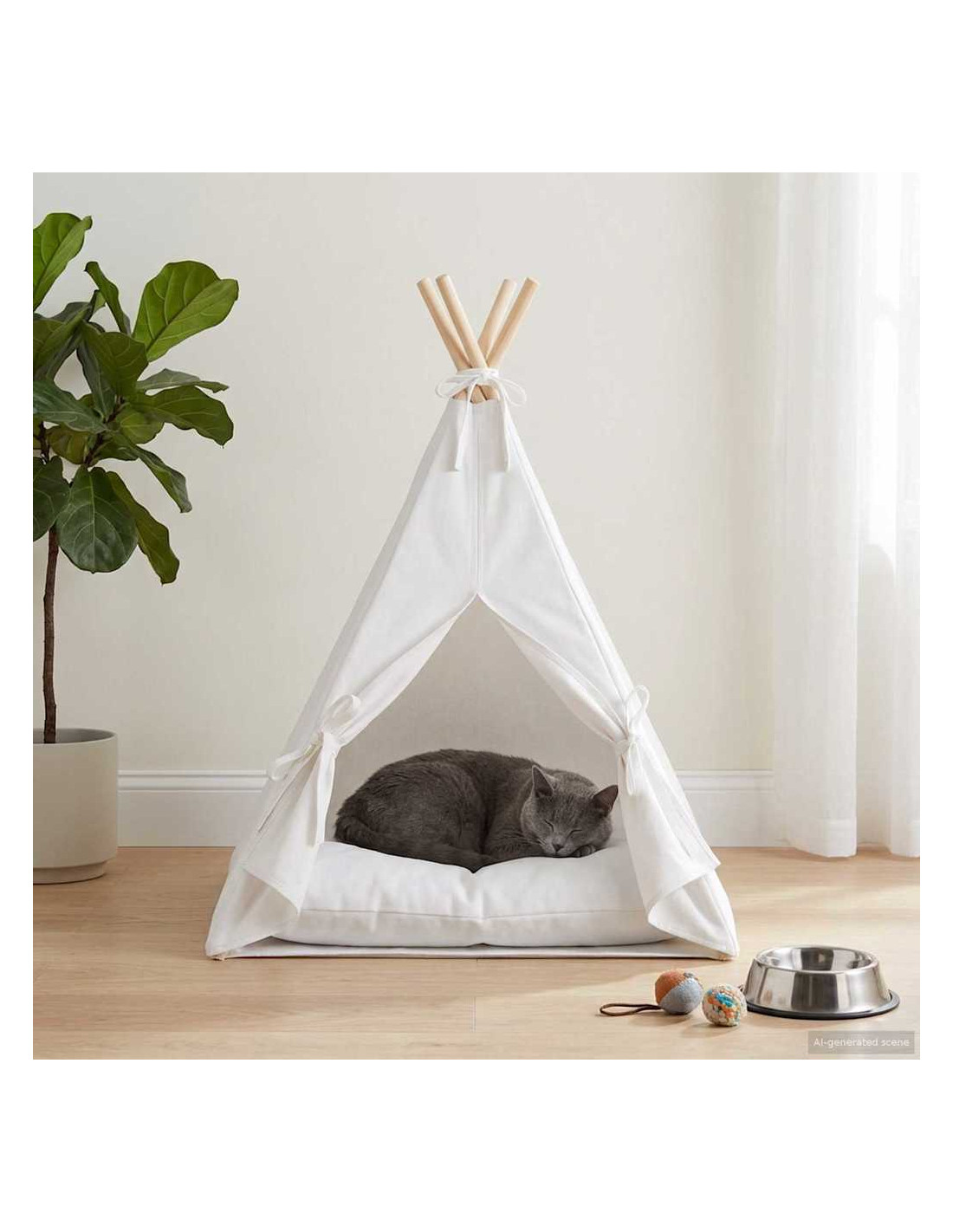 Questo teepee per animali offre uno spazio tutto per il riposo dei tuoi amici a quattro zampe. Progettato per ambienti interni, si concentra su un'utilità pratica, fornendo un rifugio comodo per i tuoi animali mentre riposano. Combinando funzionalità e facilità d'uso, questa tenda è un'ottima aggiunta alla tua casa, supportando il tuo animale con un'area confortevole per il riposo quotidiano. Struttura robusta: I pali sono fatti in legno di pino solido, offrendo un supporto stabile e un aspetto naturale. Il telaio mantiene la tenda eretta e bilanciata per uso quotidiano, creando un'area di riposo affidabile per gli animali. Tessuto e cuscino resistenti: La tenda è in tessuto di poliestere, progettata per l'uso quotidiano dagli animali. Il tessuto è morbido e traspirante, per un ambiente confortevole. All'interno, un cuscino morbido garantisce una superficie confortevole e rimane ben sagomato nel tempo, creando uno spazio accogliente per il relax. Design pieghevole per la conservazione: La struttura pratica rende il montaggio facile, senza bisogno di attrezzi complicati. Quando non la usi, il cuscino interno può essere tolto e i pali di legno possono essere smontati, permettendo alla tenda di occupare meno spazio. Questo design facilita la conservazione e il cambiamento di posizione della tenda in casa. Corde di legatura sicure: Le corde di legatura sono integrate all'ingresso per fissare la tenda ordinatamente su entrambi i lati. Questa caratteristica semplice mantiene l'apertura accessibile e l'aspetto ordinato. La tenda rimane fissa anche quando gli animali entrano o escono. Manutenzione semplice: Tenere pulito questo teepee è semplice e adatto per l'uso quotidiano. Le superfici in tessuto e cuscino possono essere facilmente pulite con un panno umido, mantenendo lo spazio di riposo fresco nel tempo.