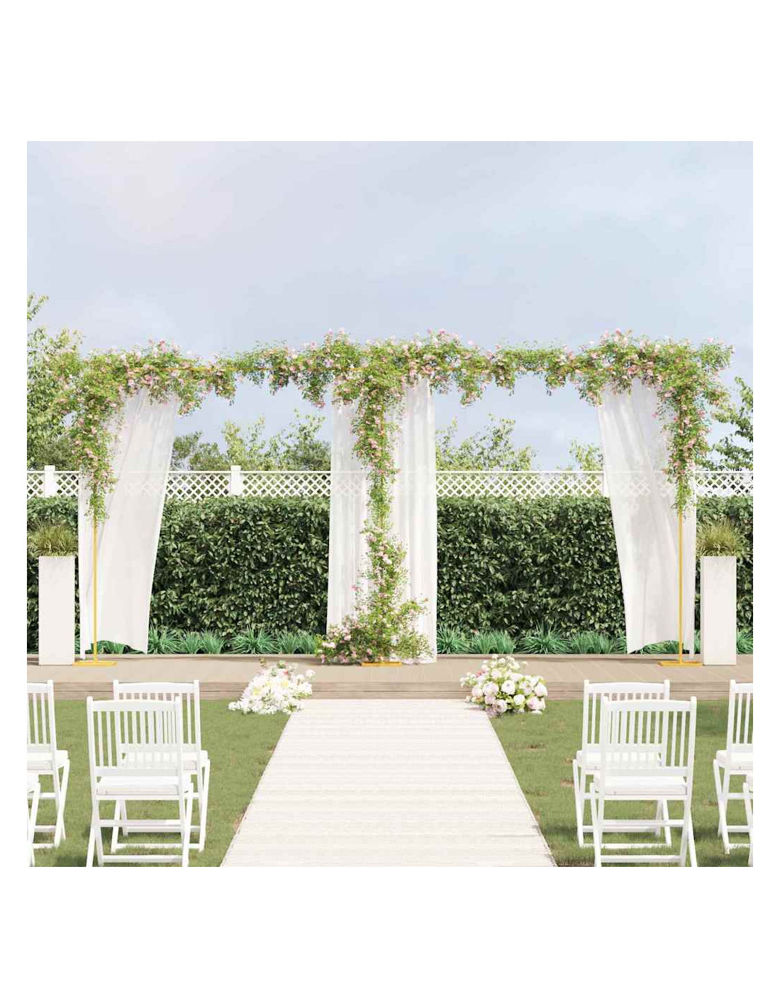 - Design funzionale: L'arco ha una forma quadrata che crea un forte impatto visivo. È perfetto per occasioni cerimoniali o come elemento decorativo permanente nel tuo giardino, combinando utilità e fascino.