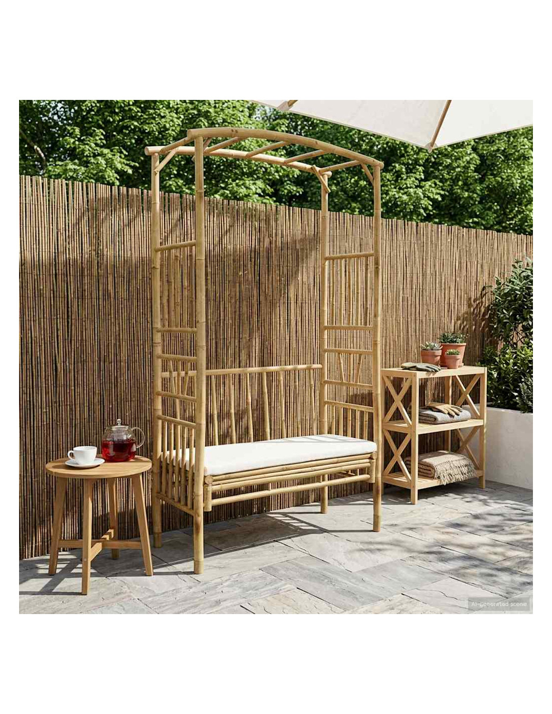 Questo arco da giardino moderno con panchina unisce mix di materiali e design per aggiungere qualcosa di speciale al tuo spazio all'aperto. Fatto principalmente in bambù, mostra una bella venatura naturale che si abbina a qualsiasi giardino o patio. Le sue linee pulite e la forma rettangolare riflettono uno stile moderno, bilanciando funzionalità e bellezza per chi ama stare fuori. Materiali: Questa panchina è in bambù, un materiale rinnovabile. La sua finitura naturale la rende unica e si integra bene nel tuo giardino. Le fibre garantiscono resistenza e flessibilità, mantenendo la panchina bella e funzionale nel tempo. Gambe robuste: Progettate con gambe forti, questa seduta offre stabilità e supporto. La loro forma cilindrica è ideale per resistere alle intemperie. Lo stile rustico delle gambe si adatta a vari tipi di arredamento esterno. Estetica moderna: Con uno stile moderno fatto di linee pulite e minimalismo, l'arco da giardino con panchina non solo arreda, ma diventa un punto focale elegante senza appesantire l'ambiente. Versatilità all'aperto: Perfetta per giardini e patii, questa panchina è molto versatile. Il suo aspetto naturale si sposa con vari temi esterni, utile sia come seduta che come elemento decorativo. Manutenzione facile: Basta pulire la superficie con un panno asciutto e coprire la panchina durante la pioggia per mantenerla in ordine. Così dura più a lungo e resta un posto accogliente negli anni.