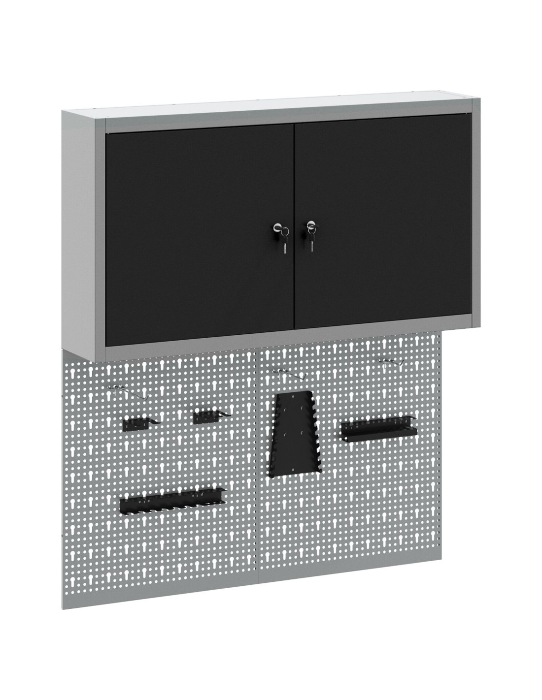 Questo set di armadi da parete e tavole forate è fondamentale per tenere in ordine la tua officina o garage. Con un look industriale moderno, fatto di acciaio verniciato a polvere e in una bella finitura grigia, è progettato per interni. Ti offre una soluzione sicura per riporre gli attrezzi in modo ordinato e accessibile, mentre la tavola forata ti aiuta a tenere tutto a portata di mano e ben organizzato.