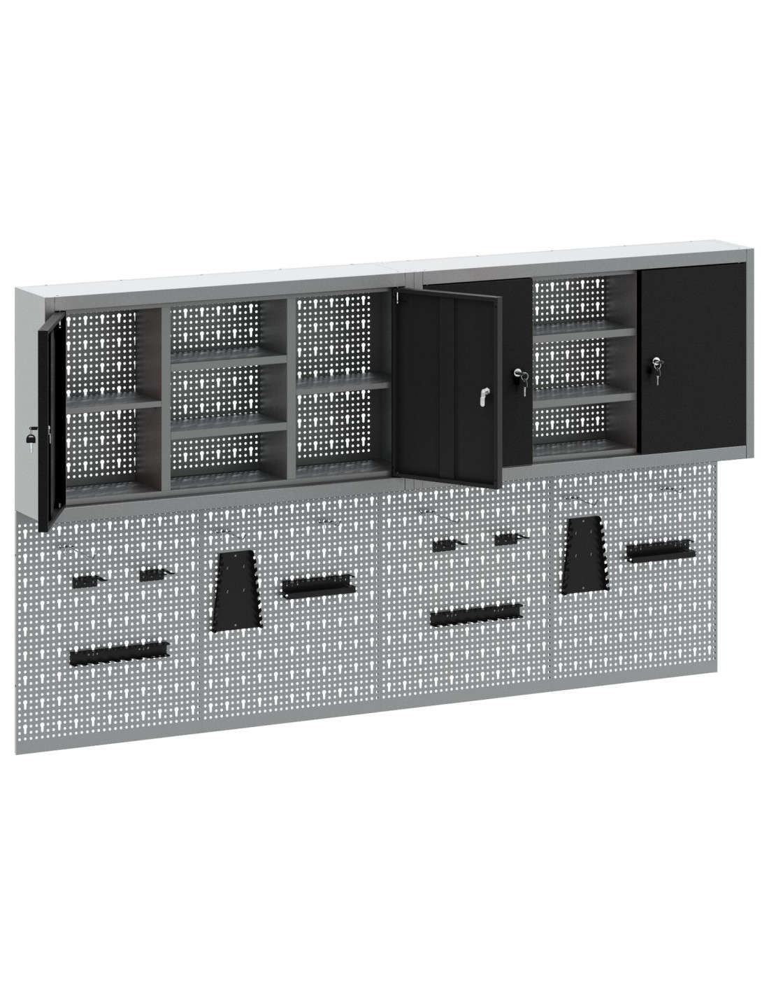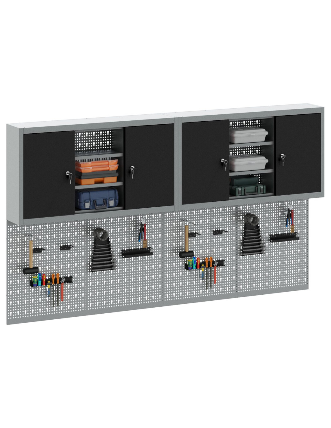 Questo set di armadi da parete e tavole forate è fondamentale per tenere in ordine la tua officina o garage. Con un look industriale moderno, fatto di acciaio verniciato a polvere e in una bella finitura grigia, è progettato per interni. Ti offre una soluzione sicura per riporre gli attrezzi in modo ordinato e accessibile, mentre la tavola forata ti aiuta a tenere tutto a portata di mano e ben organizzato.