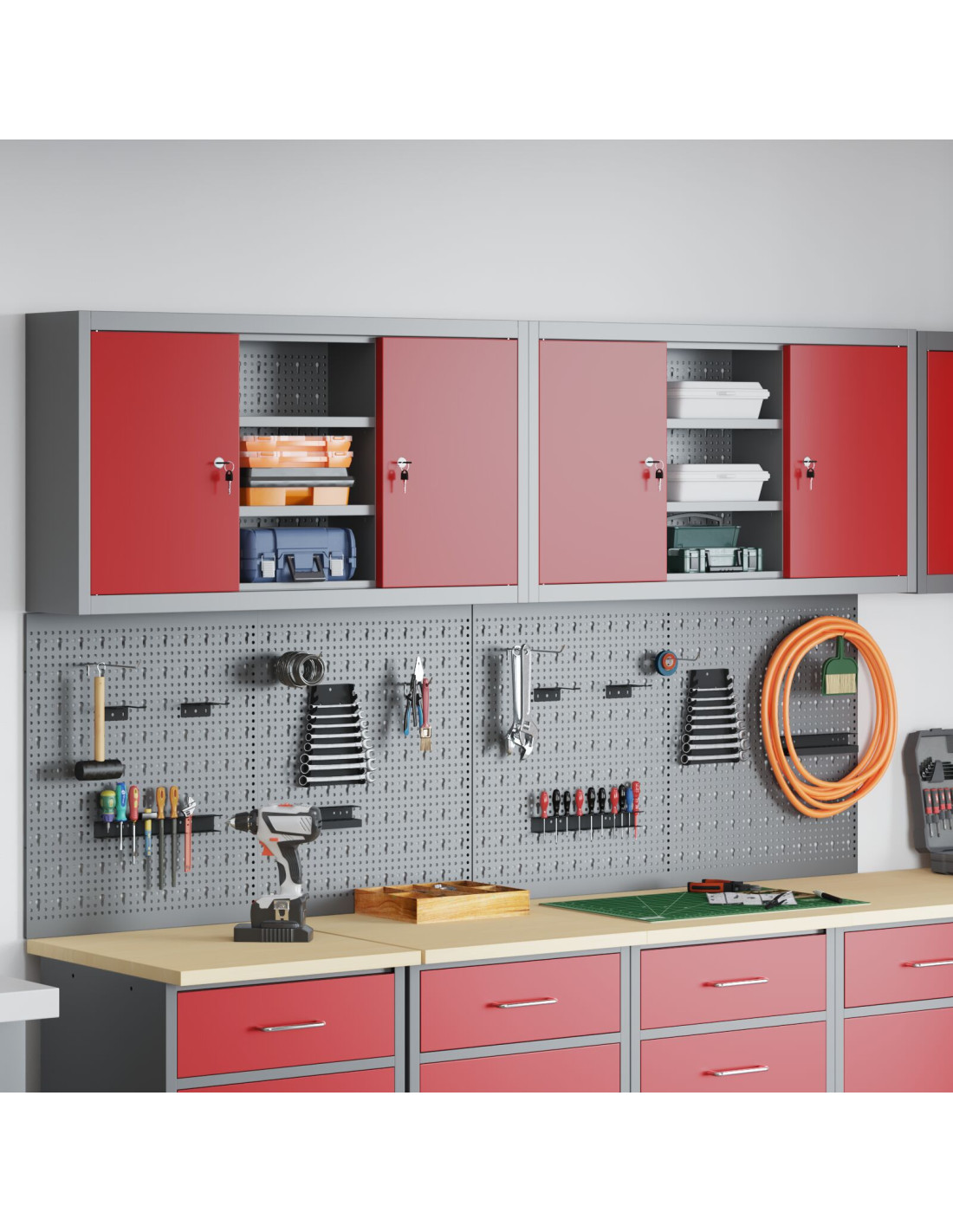 Questo set di armadi da parete e tavole forate è fondamentale per tenere in ordine la tua officina o garage. Con un look industriale moderno, fatto di acciaio verniciato a polvere e in una bella finitura grigia, è progettato per interni. Ti offre una soluzione sicura per riporre gli attrezzi in modo ordinato e accessibile, mentre la tavola forata ti aiuta a tenere tutto a portata di mano e ben organizzato.
