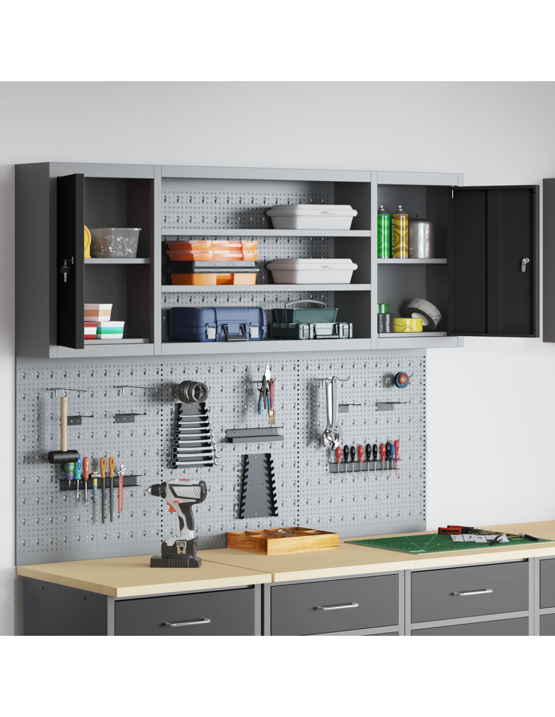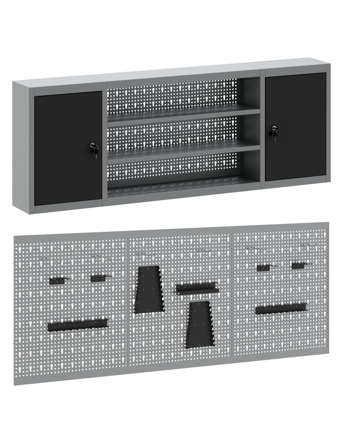 Questo set di armadi da parete e tavole forate è fondamentale per tenere in ordine la tua officina o garage. Con un look industriale moderno, fatto di acciaio verniciato a polvere e in una bella finitura grigia, è progettato per interni. Ti offre una soluzione sicura per riporre gli attrezzi in modo ordinato e accessibile, mentre la tavola forata ti aiuta a tenere tutto a portata di mano e ben organizzato.