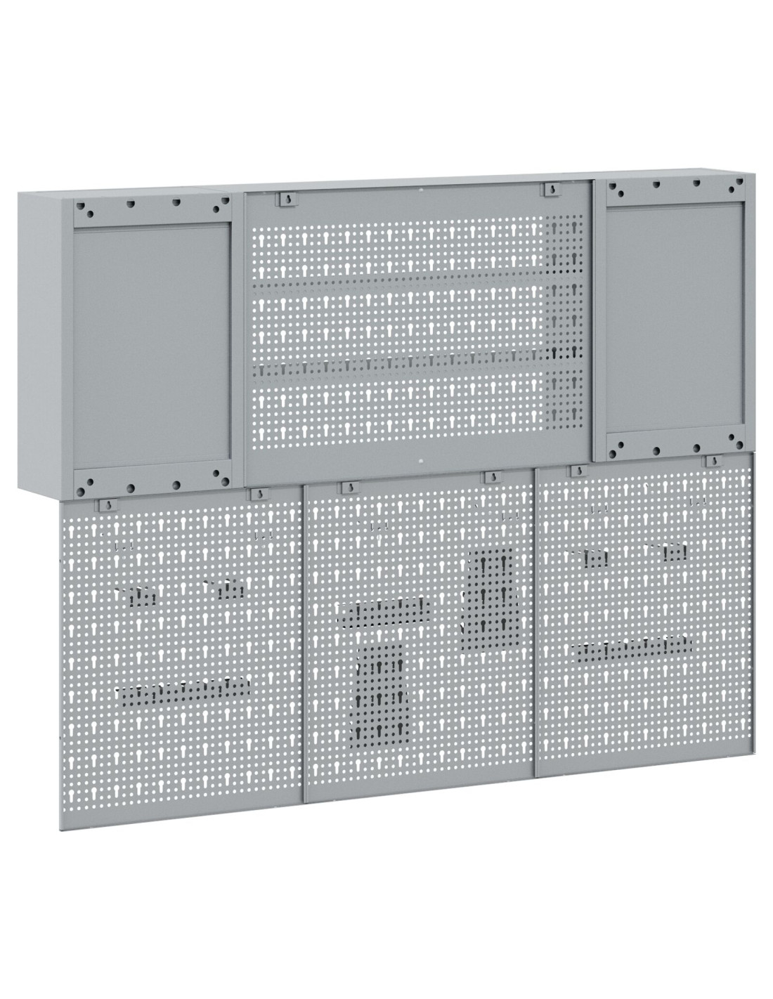 Questo set di armadi da parete e tavole forate è fondamentale per tenere in ordine la tua officina o garage. Con un look industriale moderno, fatto di acciaio verniciato a polvere e in una bella finitura grigia, è progettato per interni. Ti offre una soluzione sicura per riporre gli attrezzi in modo ordinato e accessibile, mentre la tavola forata ti aiuta a tenere tutto a portata di mano e ben organizzato.