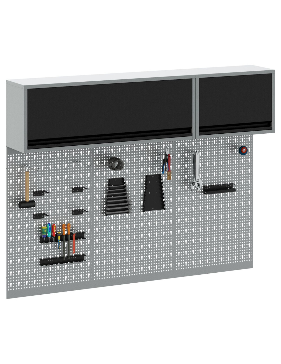 Questo set di armadi da parete e tavole forate è fondamentale per tenere in ordine la tua officina o garage. Con un look industriale moderno, fatto di acciaio verniciato a polvere e in una bella finitura grigia, è progettato per interni. Ti offre una soluzione sicura per riporre gli attrezzi in modo ordinato e accessibile, mentre la tavola forata ti aiuta a tenere tutto a portata di mano e ben organizzato.