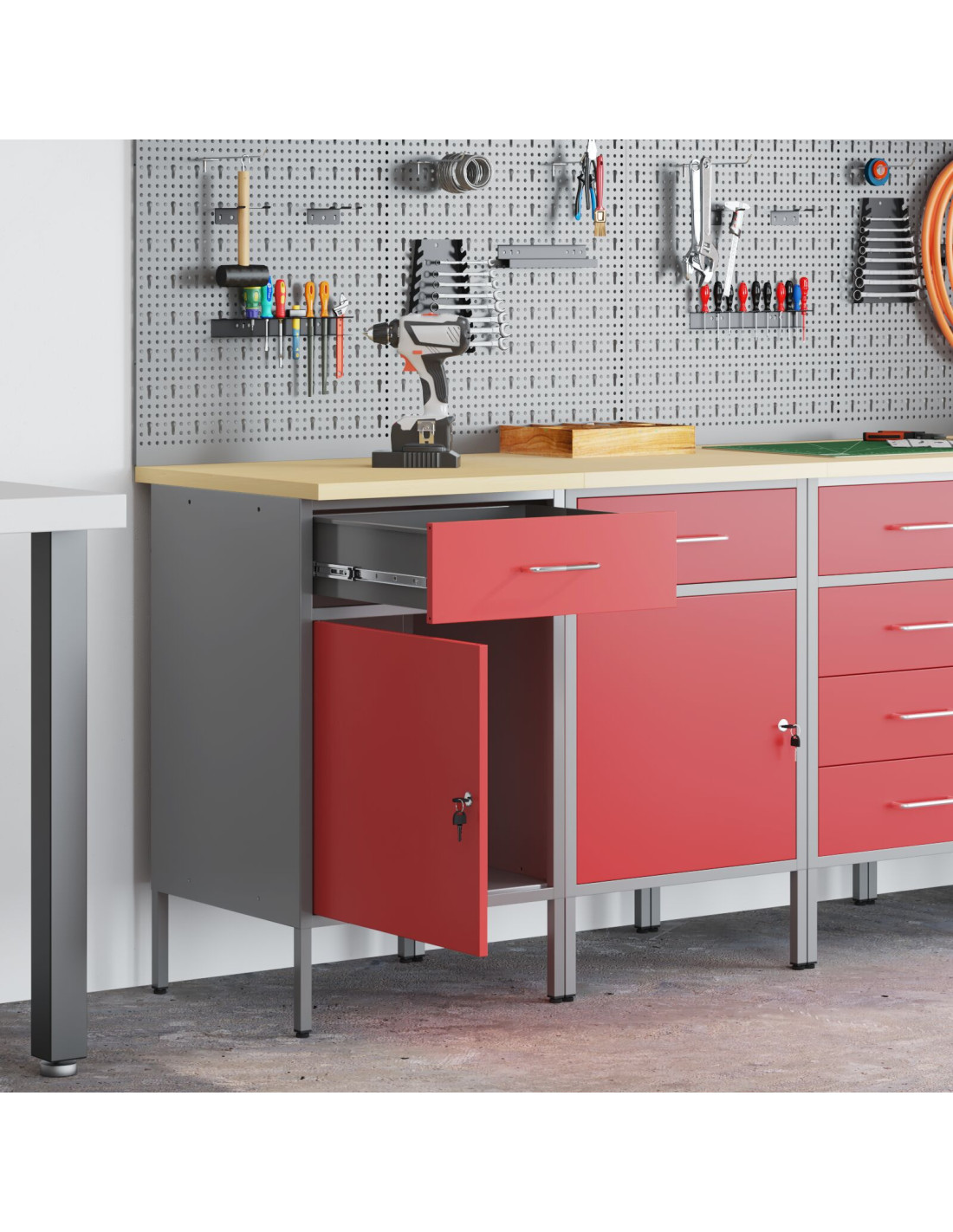- Telaio in acciaio: Fatto in legno ingegnerizzato e acciaio, questo armadietto è robusto e duraturo, perfetto per il tuo spazio di lavoro. La struttura forte rende sicuro riporre attrezzi pesanti senza preoccupazioni. Anche se è resistente, ha un aspetto elegante, migliorando l'estetica della tua officina. Mantenere pulito basta usarci un panno umido.
