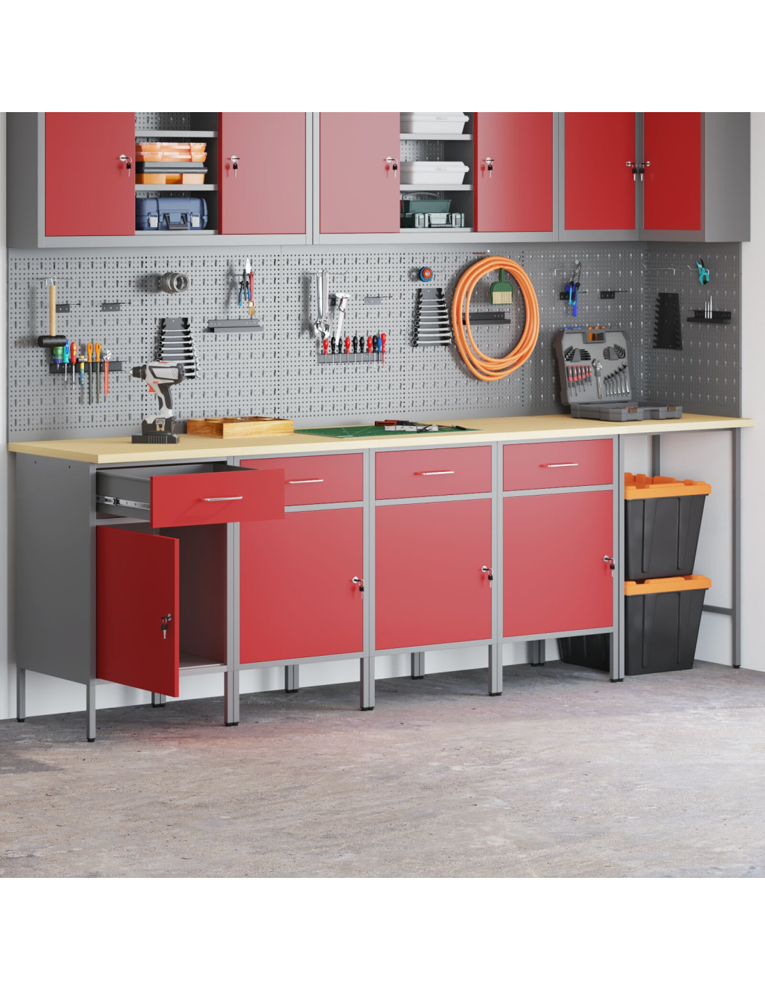 - Materiali: Questo set è realizzato in acciaio verniciato e legno ingegnerizzato, garantendo solidità e affidabilità per lo stoccaggio degli attrezzi. I materiali scelti sono resistenti e assicurano un uso prolungato. La superficie verniciata offre una buona protezione, aumentando la durata dell'armadietto.